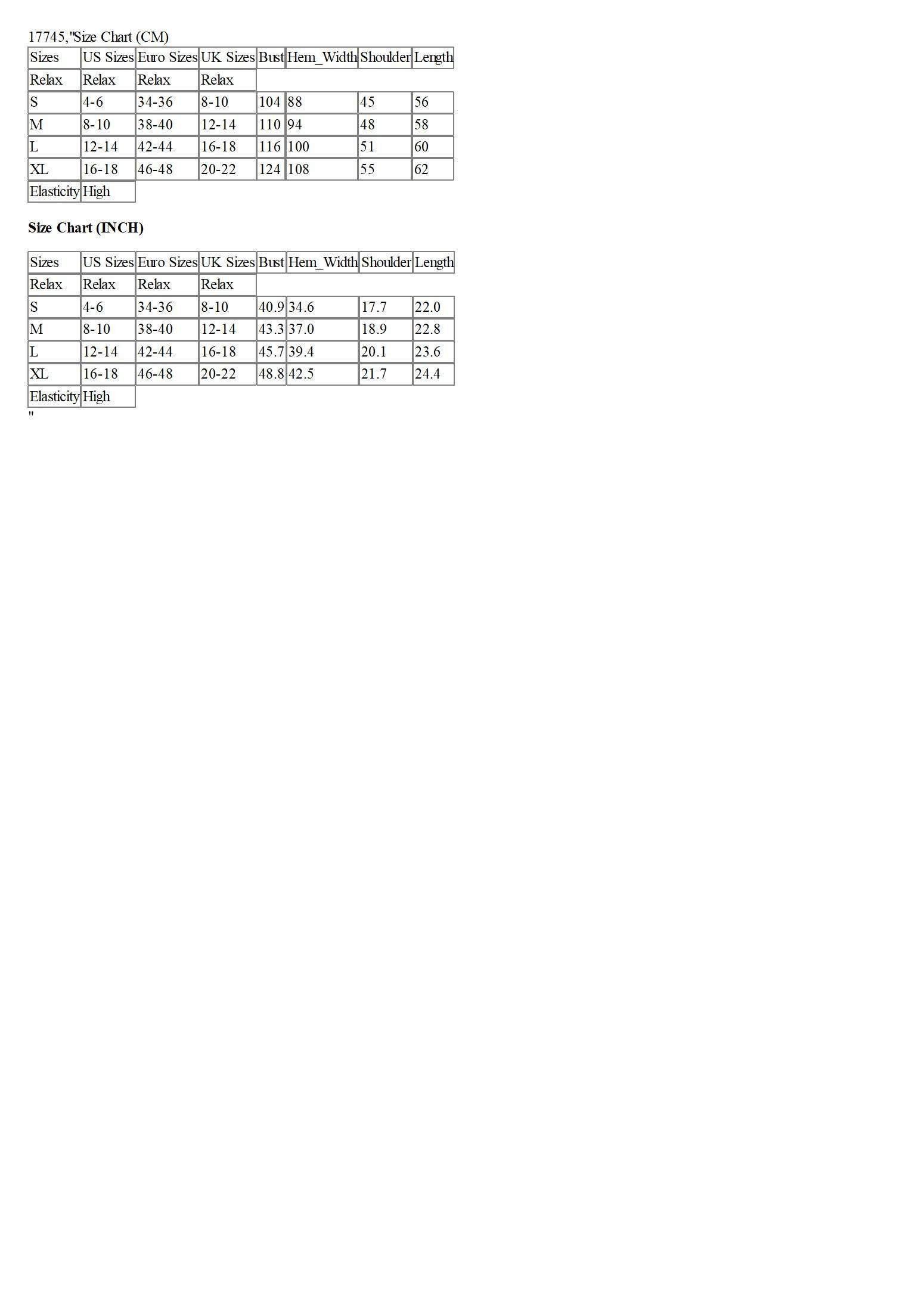 Sizes | US Sizes | Euro Sizes | UK Sizes | Bust | Hem_Width | Shoulder | Length |