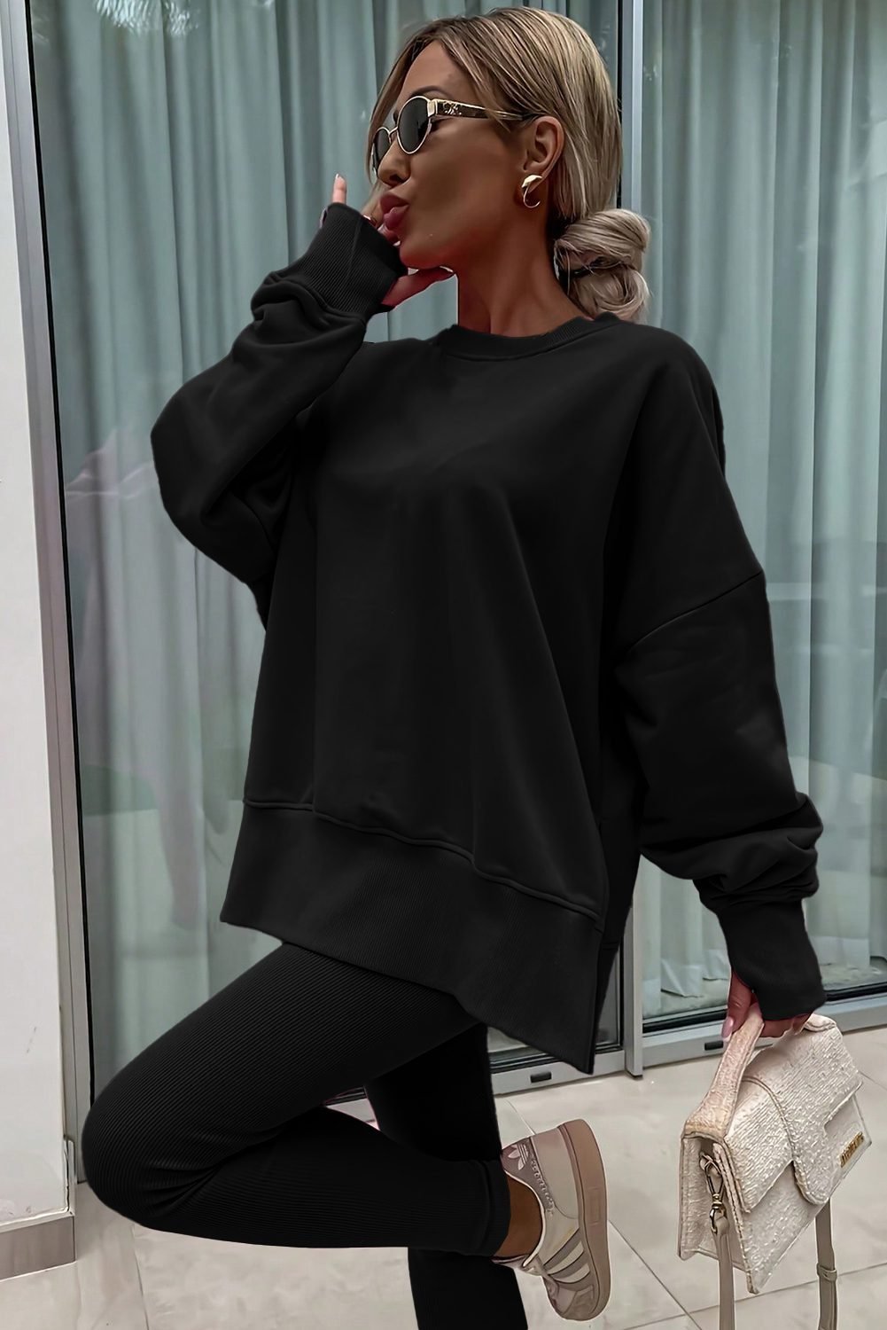 Oversize slit sweatshirt adds a trendy, relaxed silhouette.