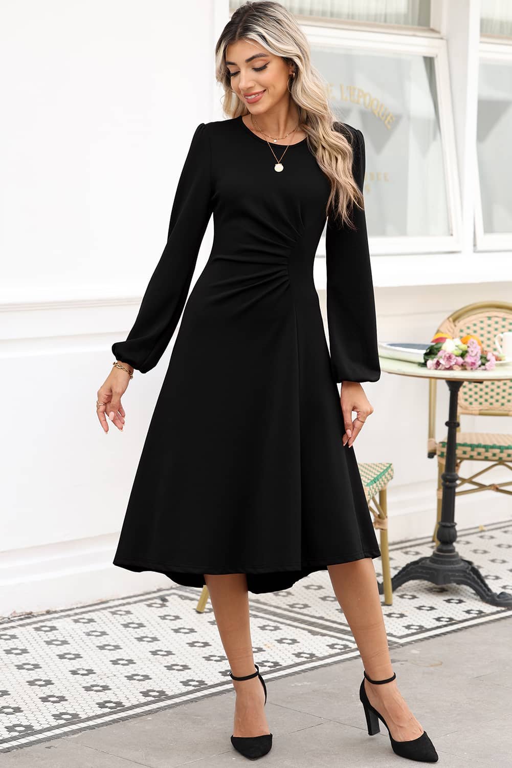 The midi length and puff sleeves make this solid dress more graceful.