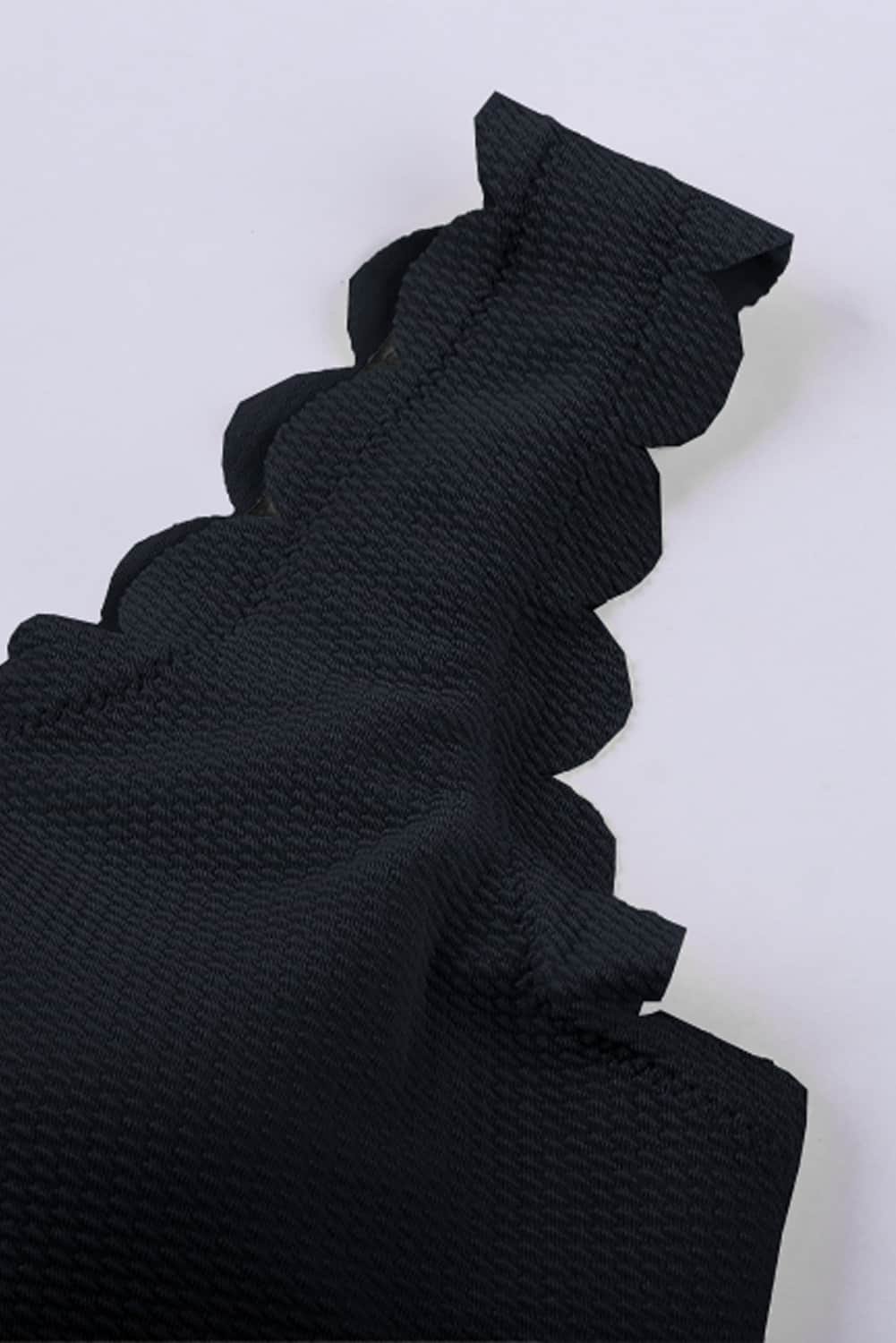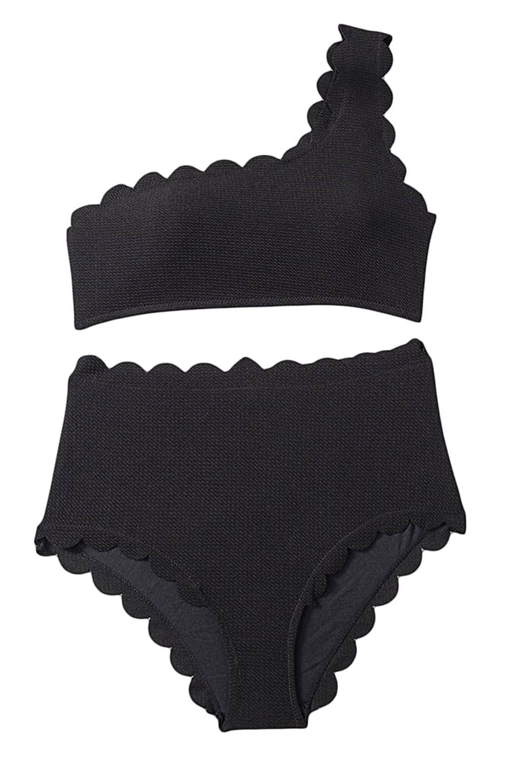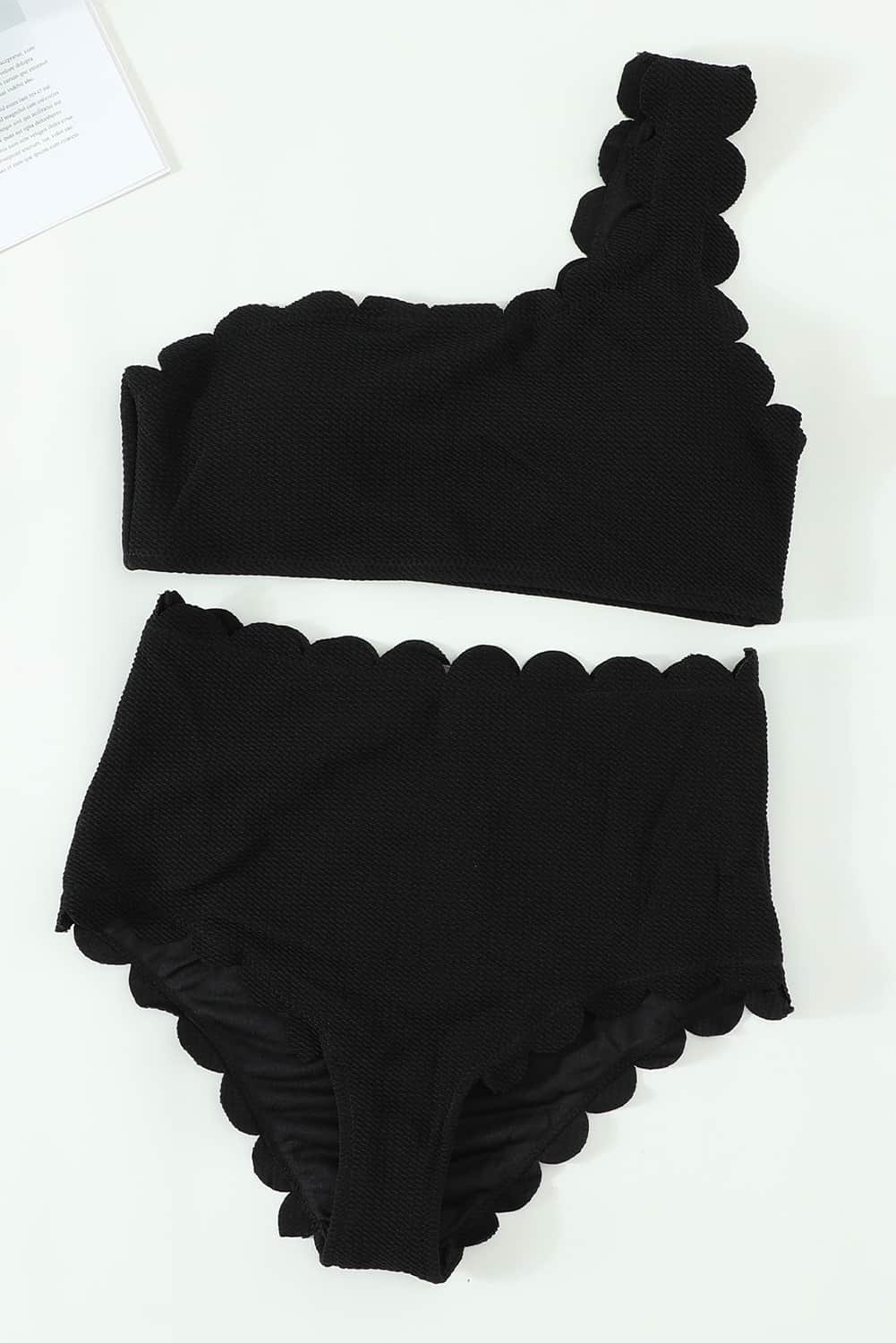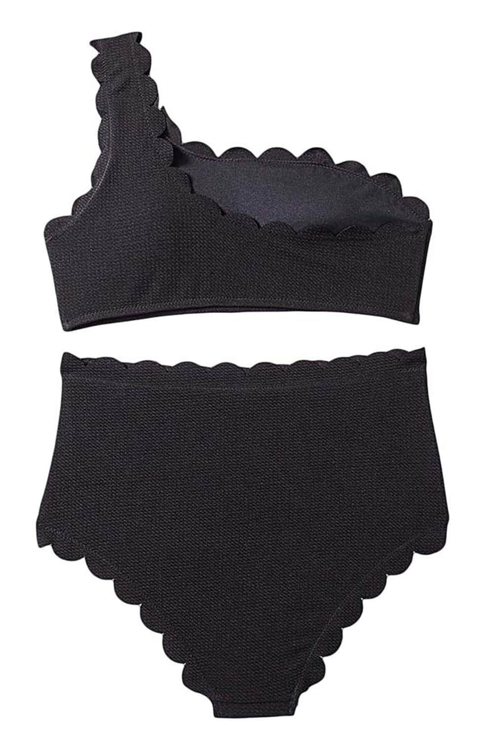 Black Solid Scalloped One-Shoulder Bikini
