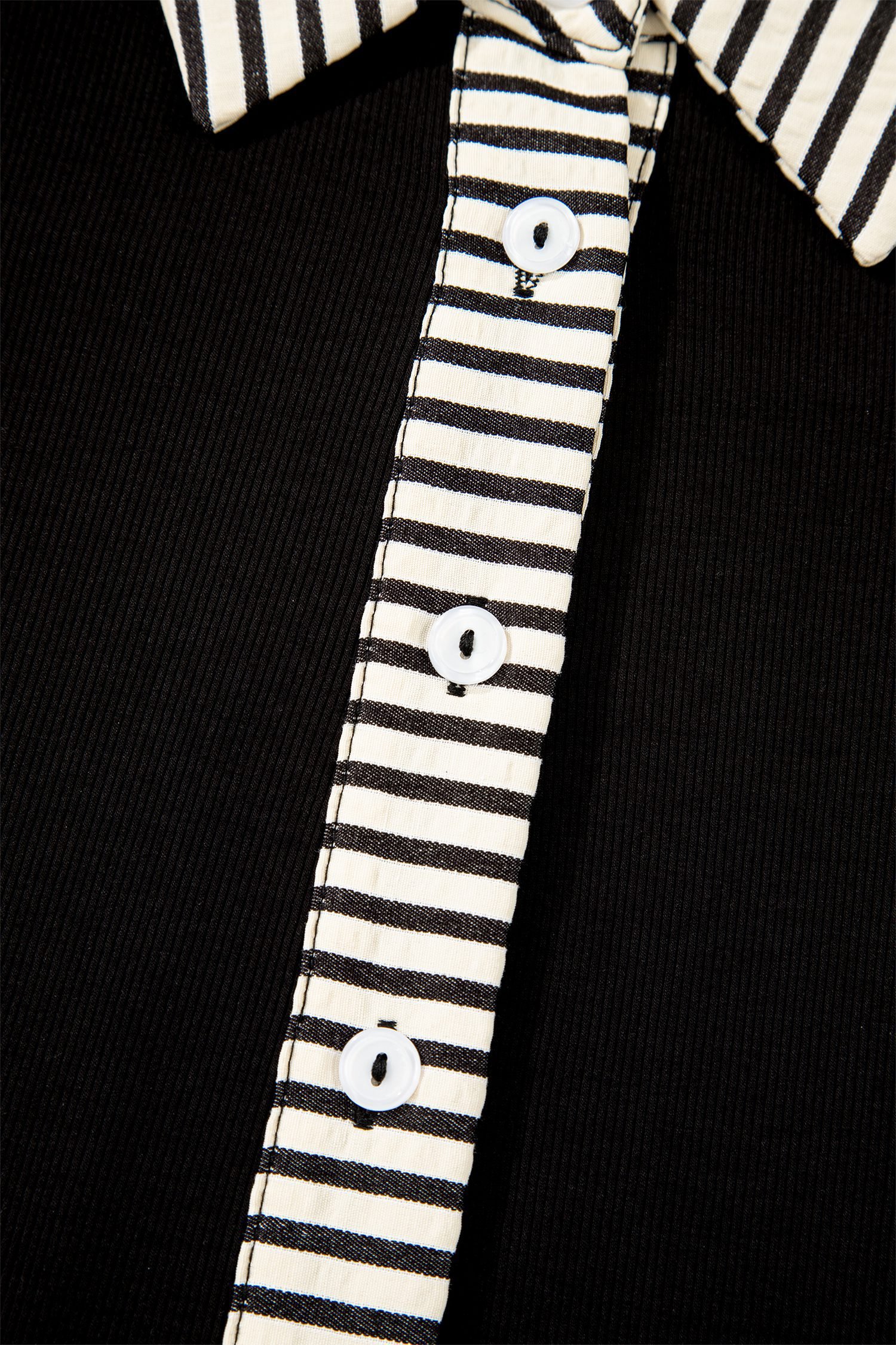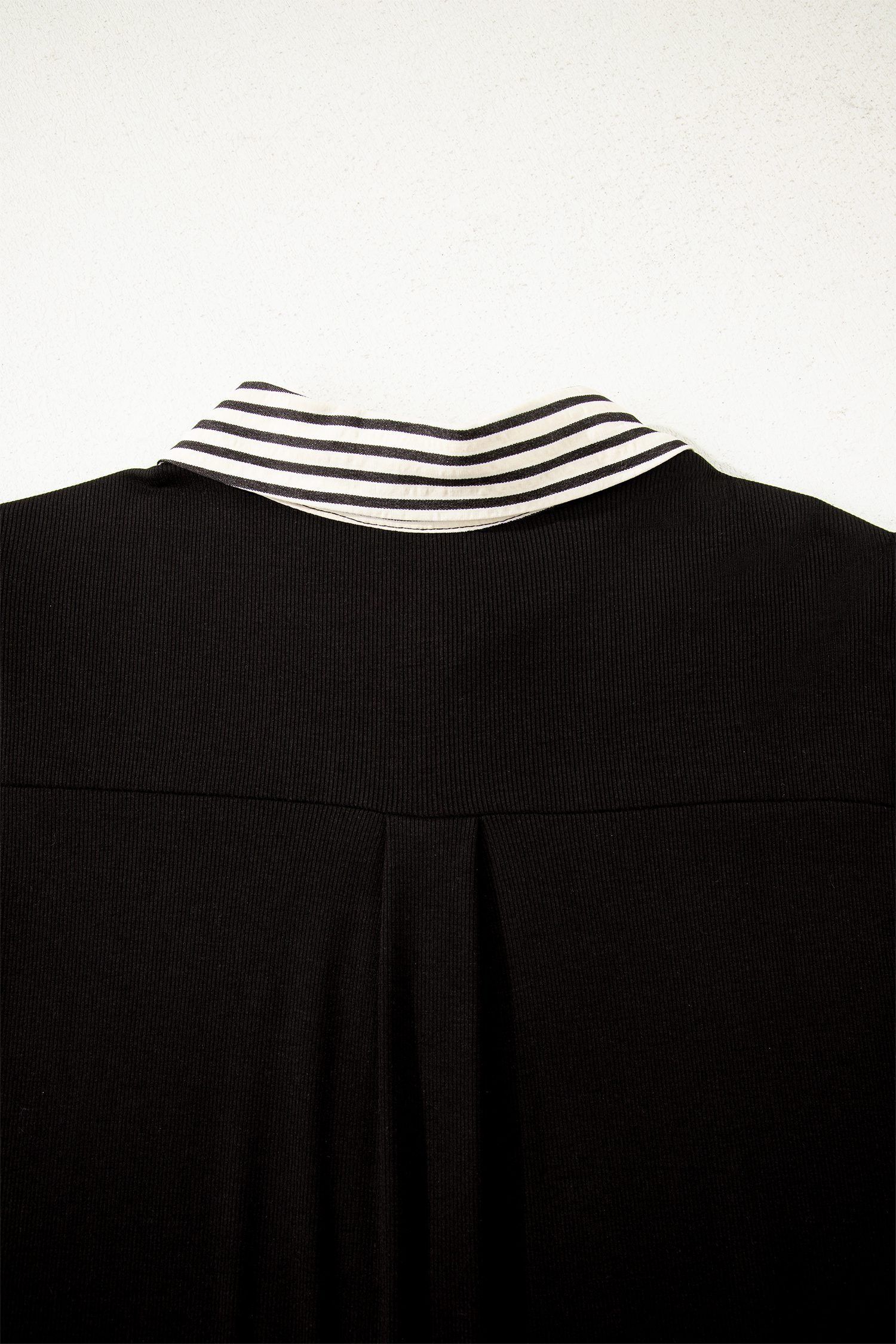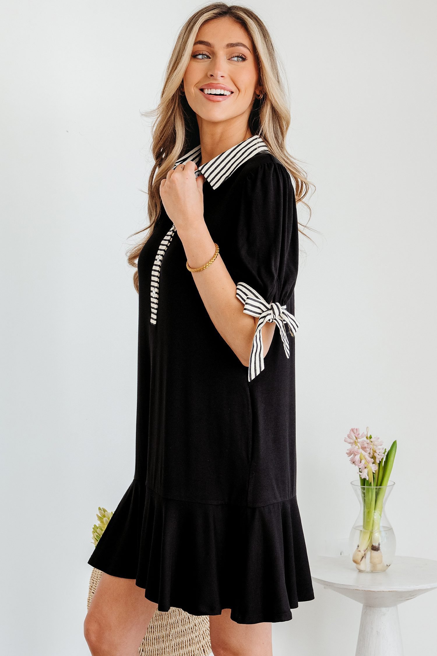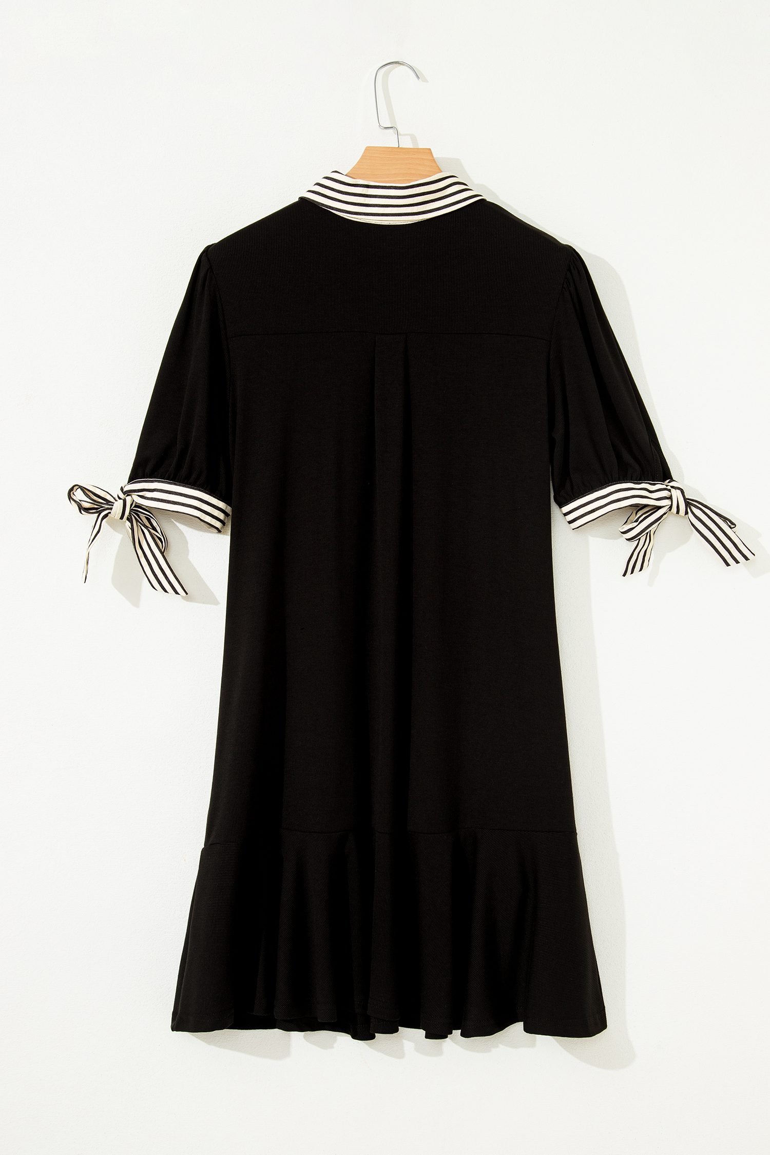 Black Stripe Detail Polo Collar Half Buttons Tied Short Sleeve Shift Mini Dress
