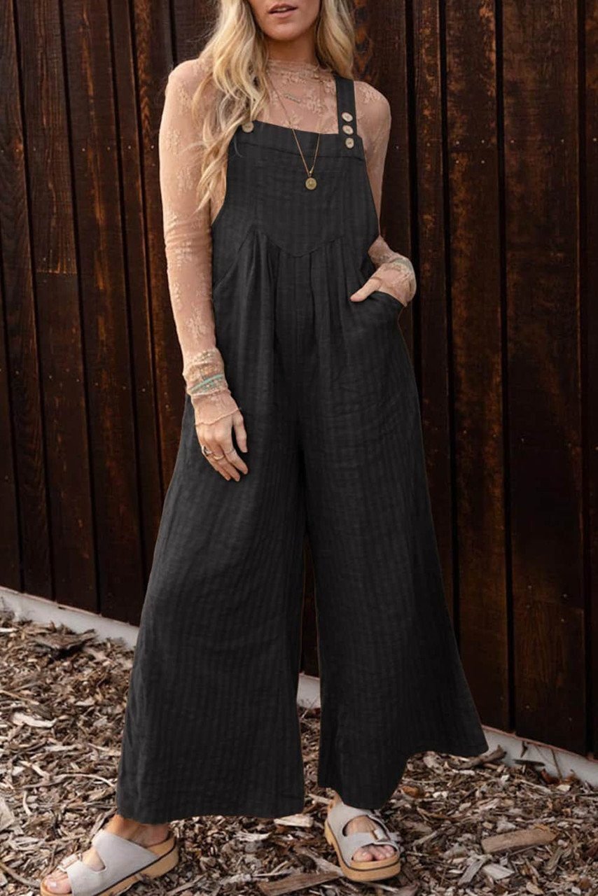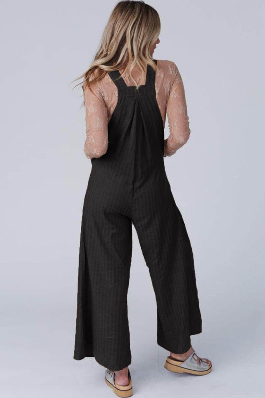 Black Striped Pleated Wide Leg Pocketed Jumpsuit