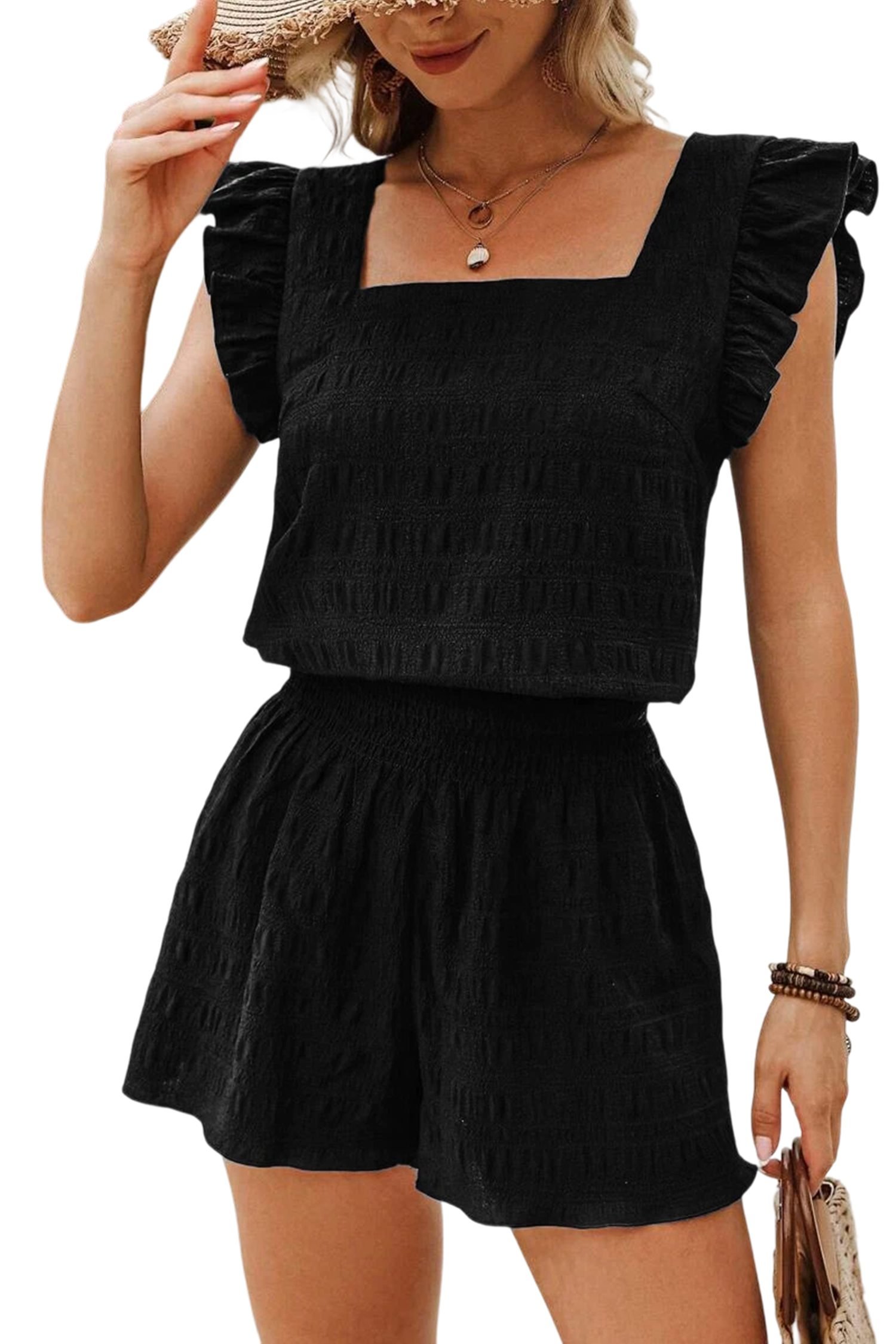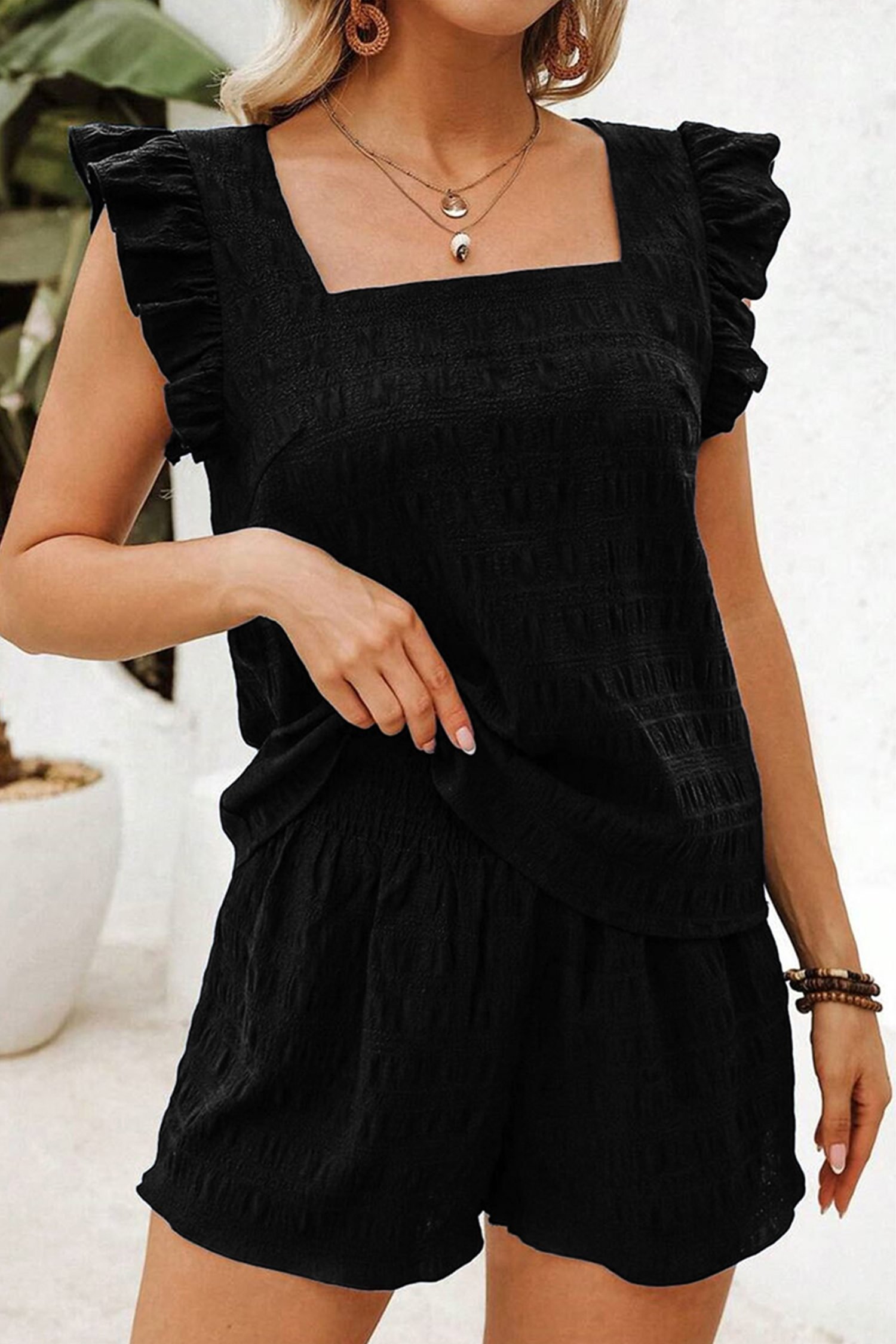 This two-piece set features a textured square neck top and shirred high waist shorts.