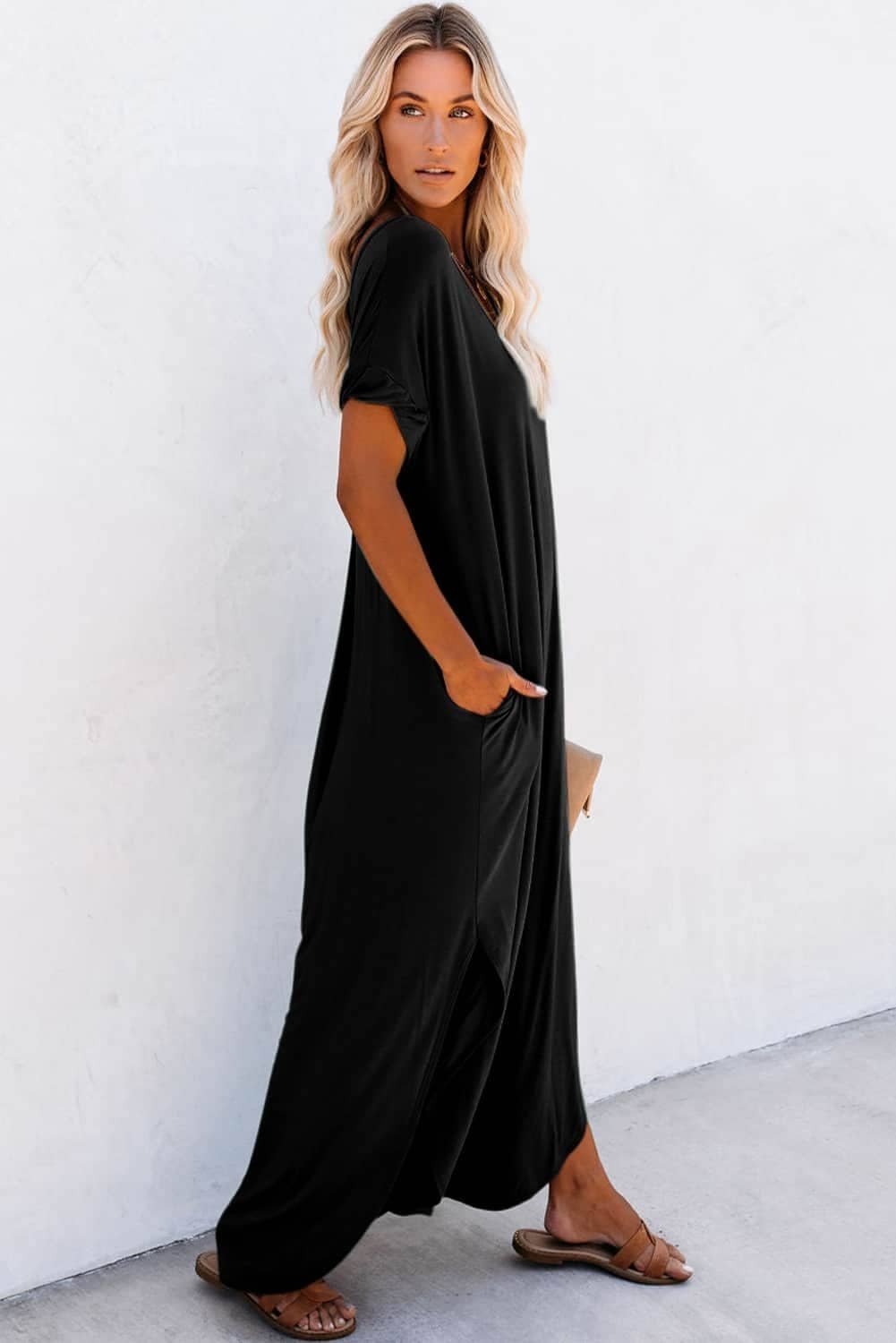 Black V Neck Hidden Pocket Splits Maxi T-Shirt Dress