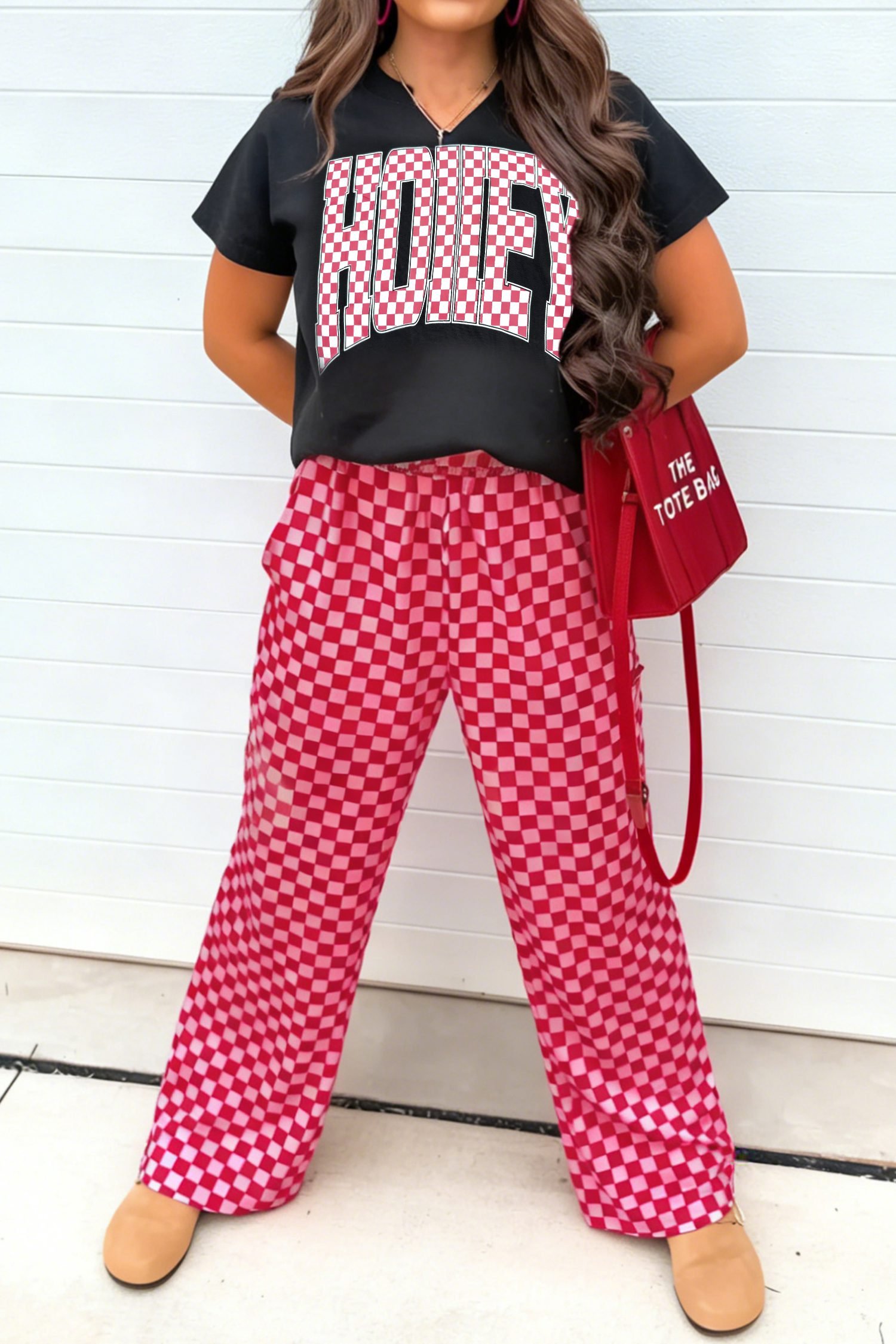 Matching loose pants in a contrasting checkered pattern.