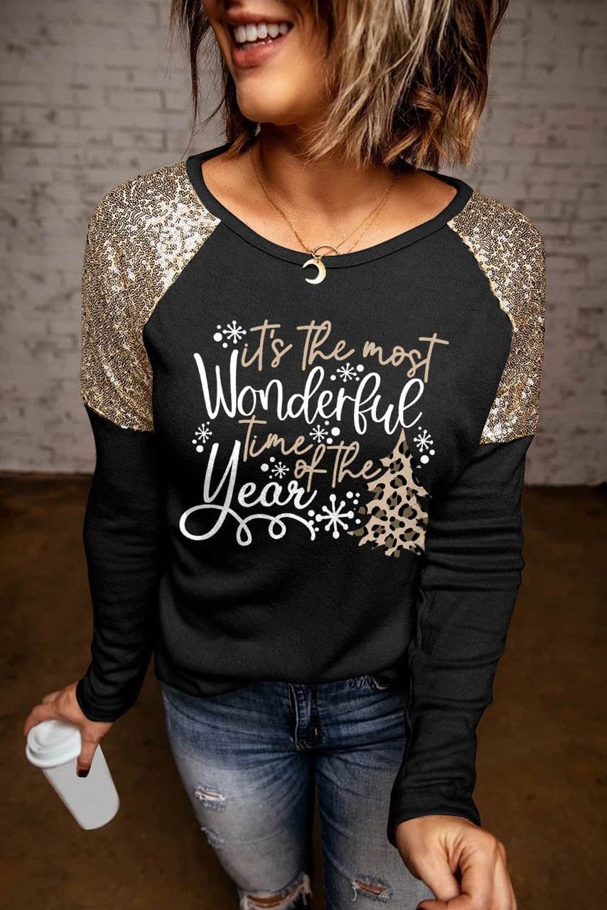Wonderful Christmas Season Graphic Sequin Shoulder Top