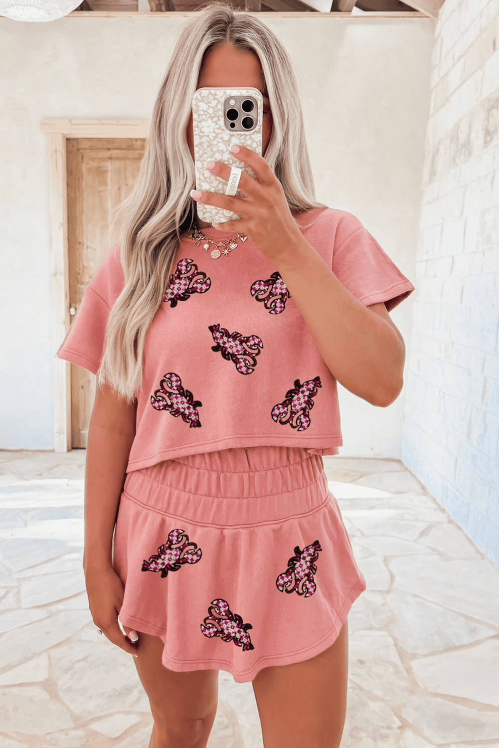 - This set features a crop tee with sequin lobster patches for a playful look.