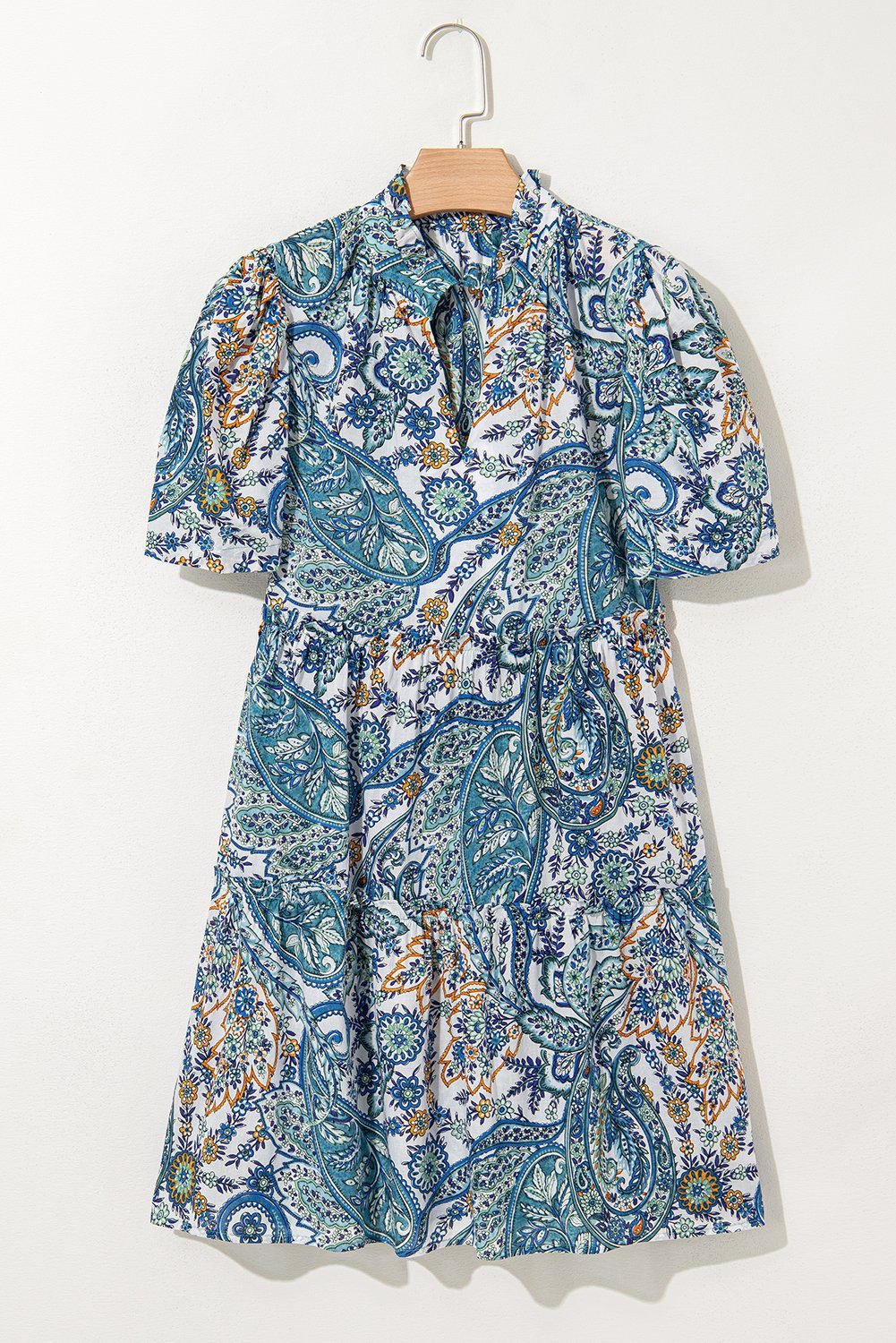 Blue Bohemian Paisley Floral V Neck Short Sleeve Mini Dress