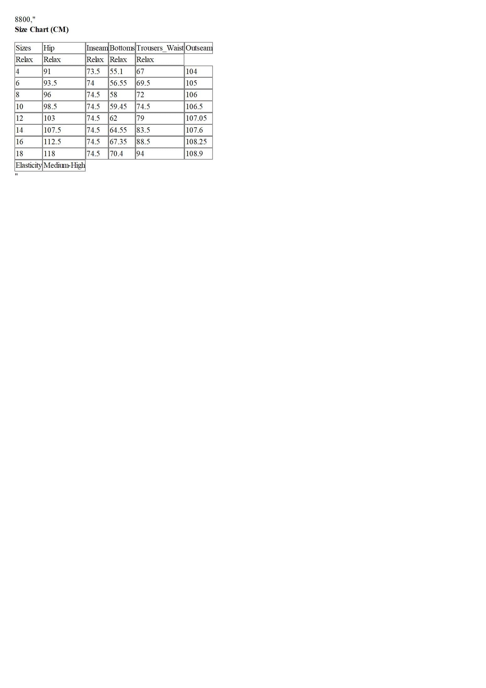 Size Chart (CM)