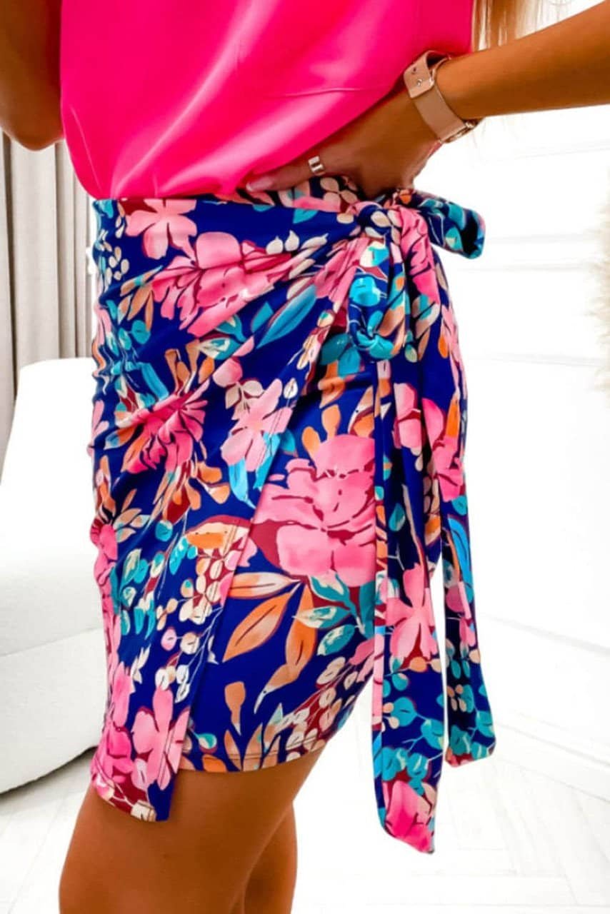 Blue Floral Print Lace-Up High Waist Bodycon Mini Skirt