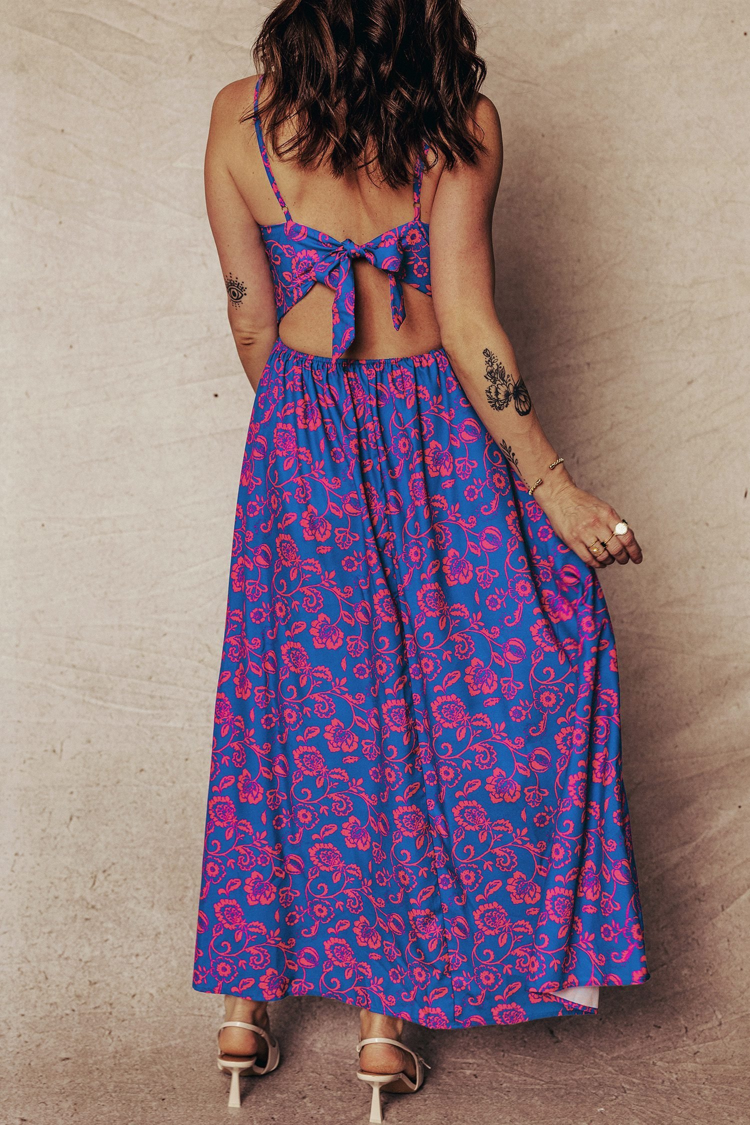 Floral maxi dress with a twisted V neck for a chic, feminine look.