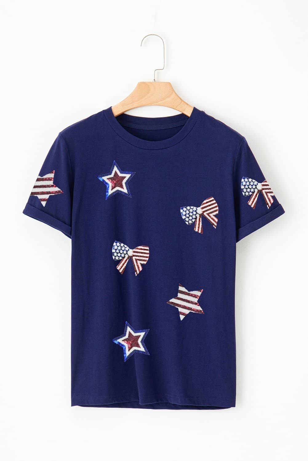 Blue Sequin Usa Flag Bow Star Graphic Crewneck T Shirt