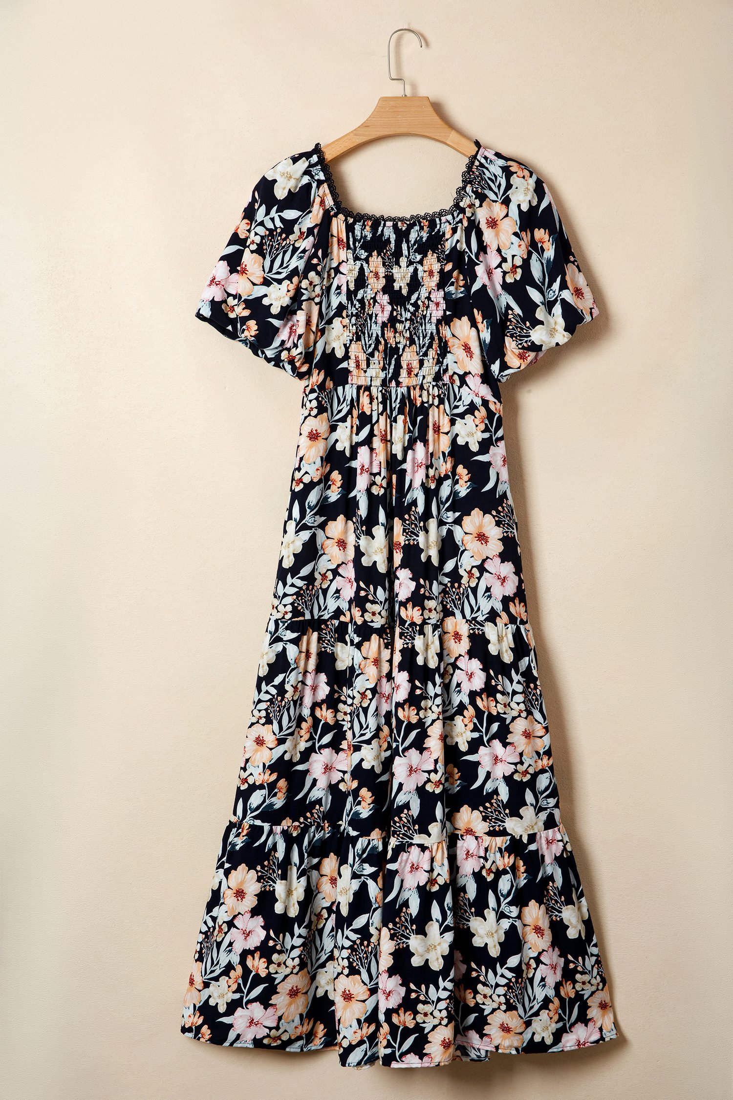 Floral maxi dress features smocked detail for a flattering, flexible fit.