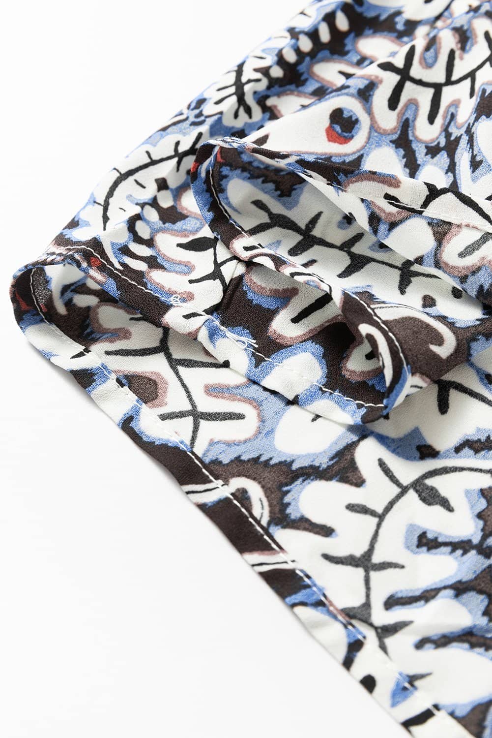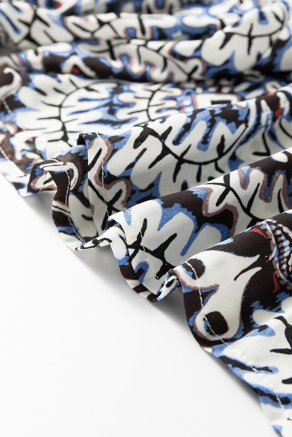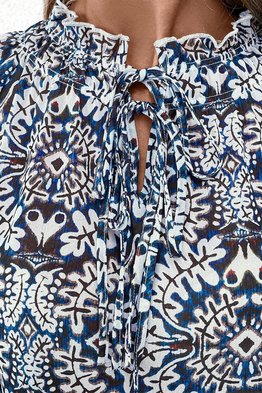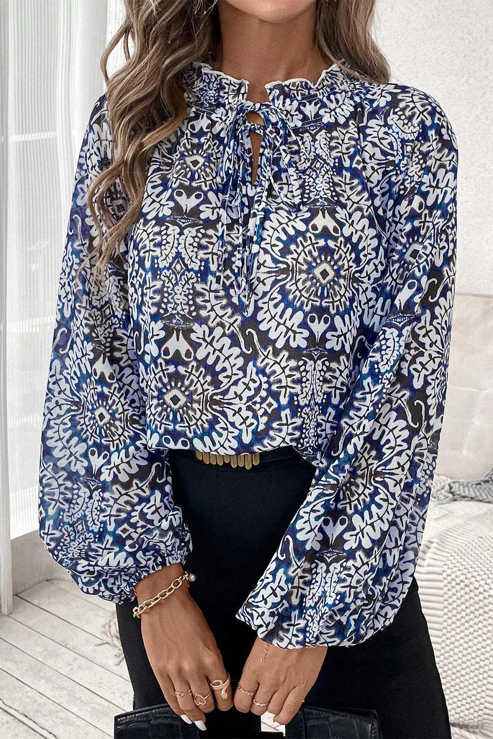 Blue Tribal Print Lace-Up Frilled Neck Puff Sleeve Blouse