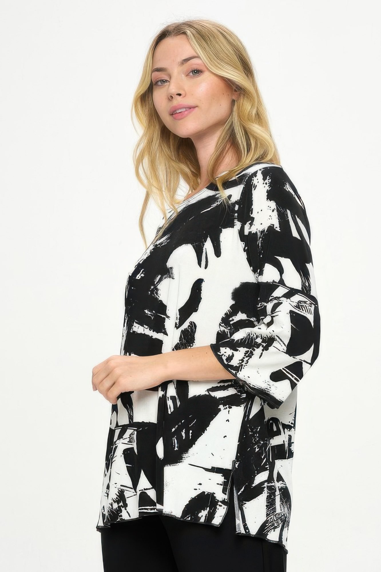 This high and low top features a flattering boat neckline and long sleeves for a sleek, modern silhouette. The asymmetric hem creates a dynamic shape with a high front and elongated back. Made from a comfortable stretch blend, it’s ideal for layering or wearing solo. Its eye-catching print adds style without overpowering your look. Whether for work or weekends, this USA-made top is a standout essential.