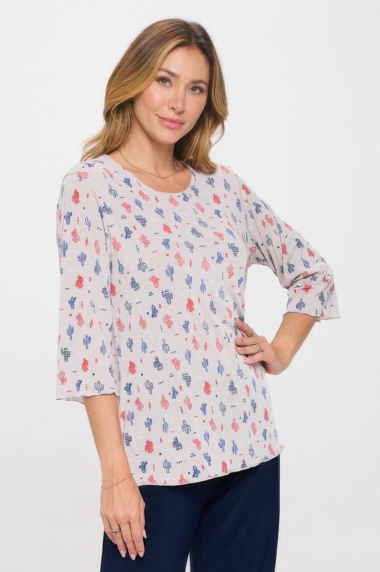 Product Description: Comfort meets elegance in the BNS Merrow Top. This printed style features quarter sleeves and a classic round neckline, making it perfect for day-to-evening transitions. The merrow hem adds a soft, stylish edge, while the stretch fabric offers all-day ease. Designed for low-maintenance care and long-lasting wear, it’s proudly made in the USA. Product Details: 94% Polyester, 6% Spandex Quarter sleeves for versatile coverage Merrow hem adds subtle texture Round neckline for a timeless look Machine or hand washable Made in the USA Size Guide: For accurate sizing guidance, please review our size chart available on the website. Shipping and Returns: Fast Shipping: We offer speedy delivery to your doorstep. Hassle-Free Returns: If you’re not completely satisfied, our flexible return policy ensures your peace of mind.