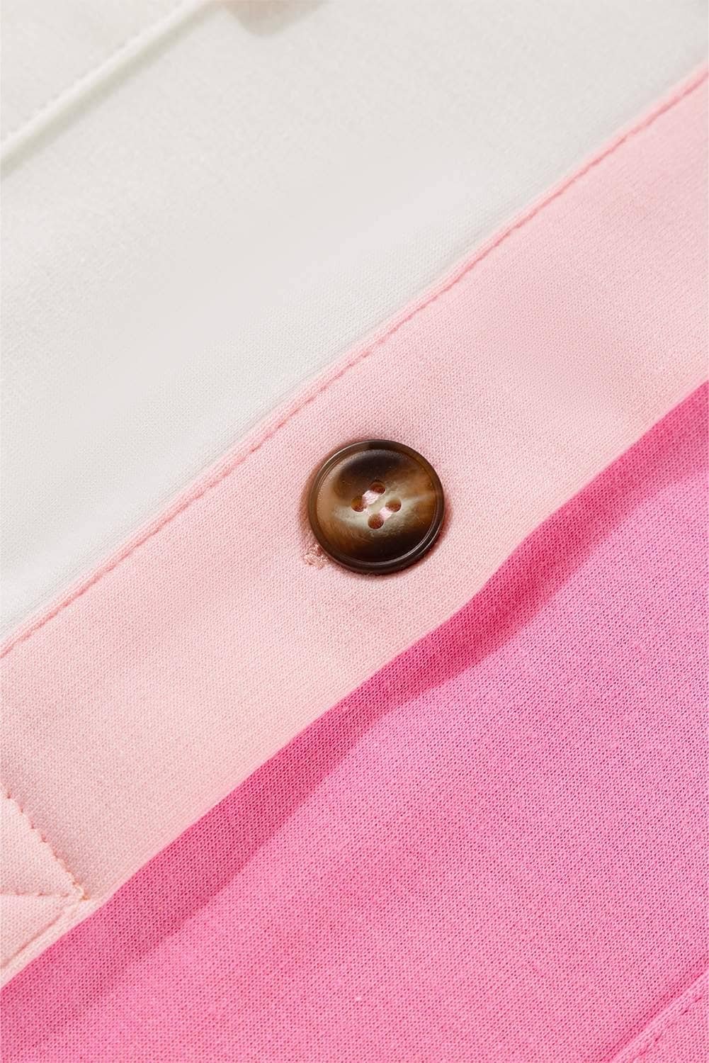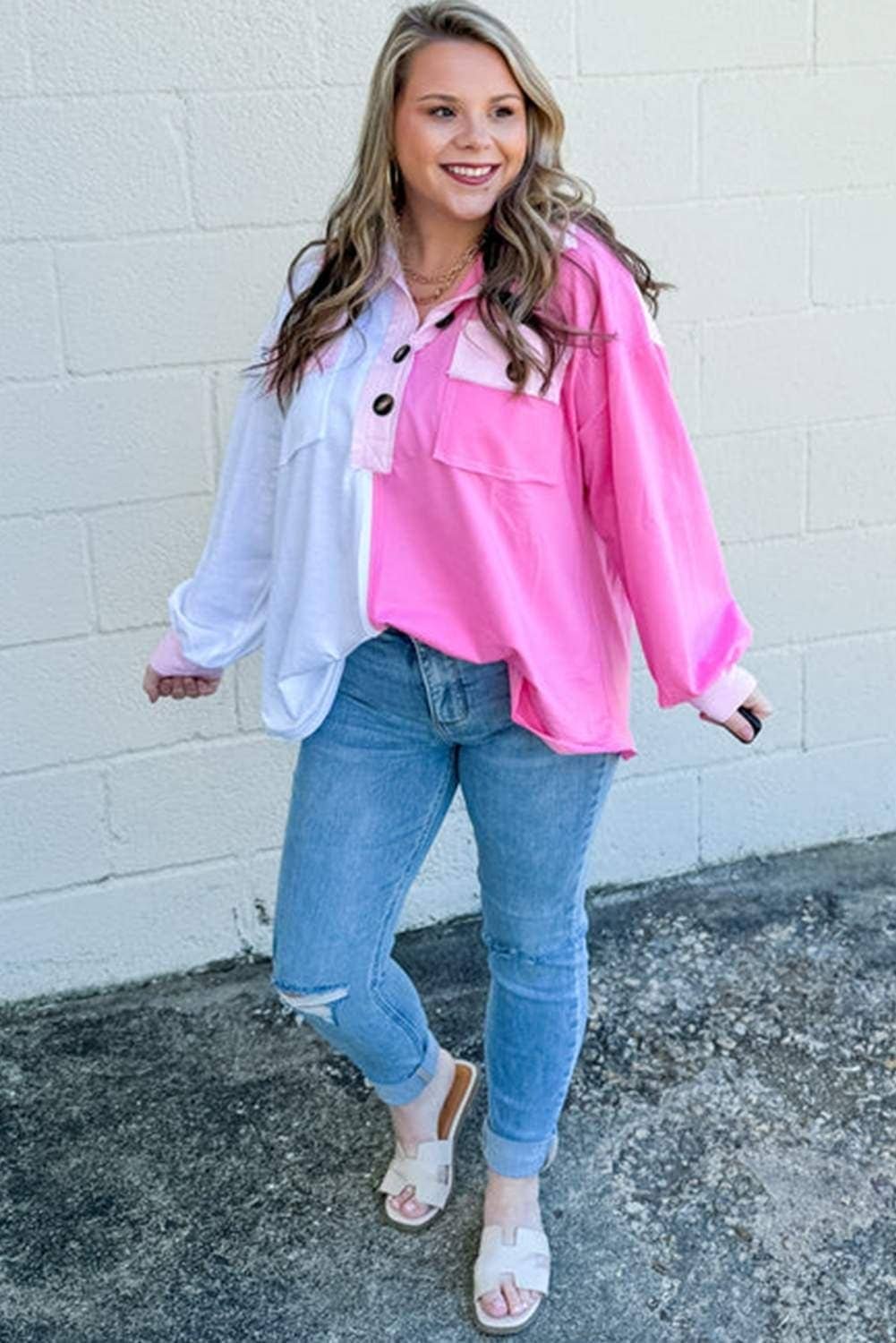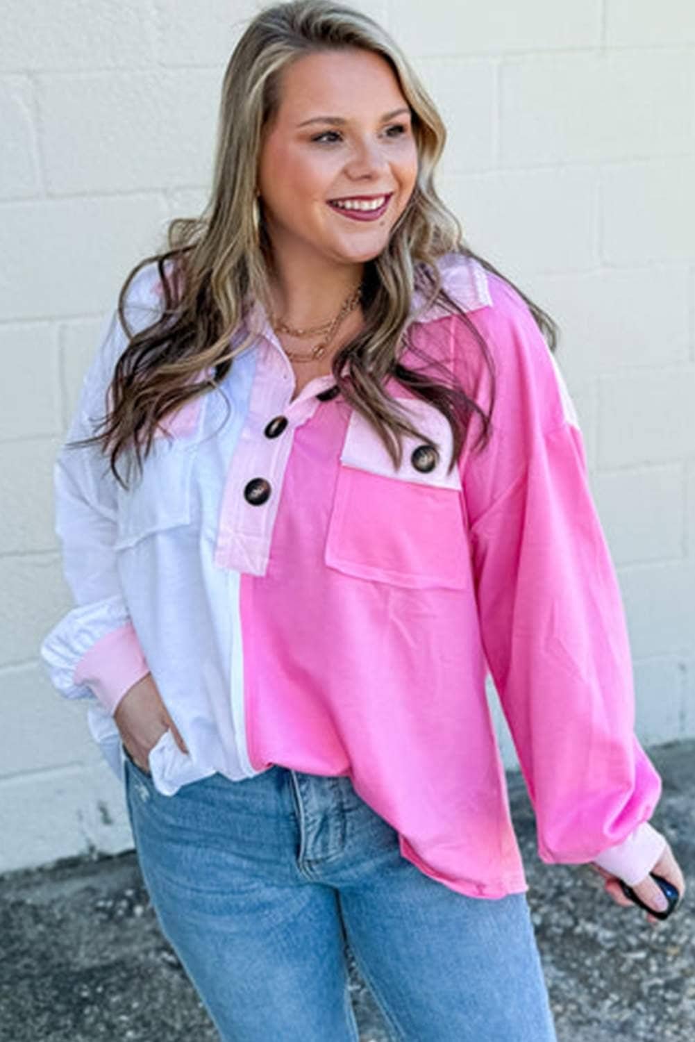Bonbon Color Block Chest Pockets Half Button Plus Size Sweatshirt