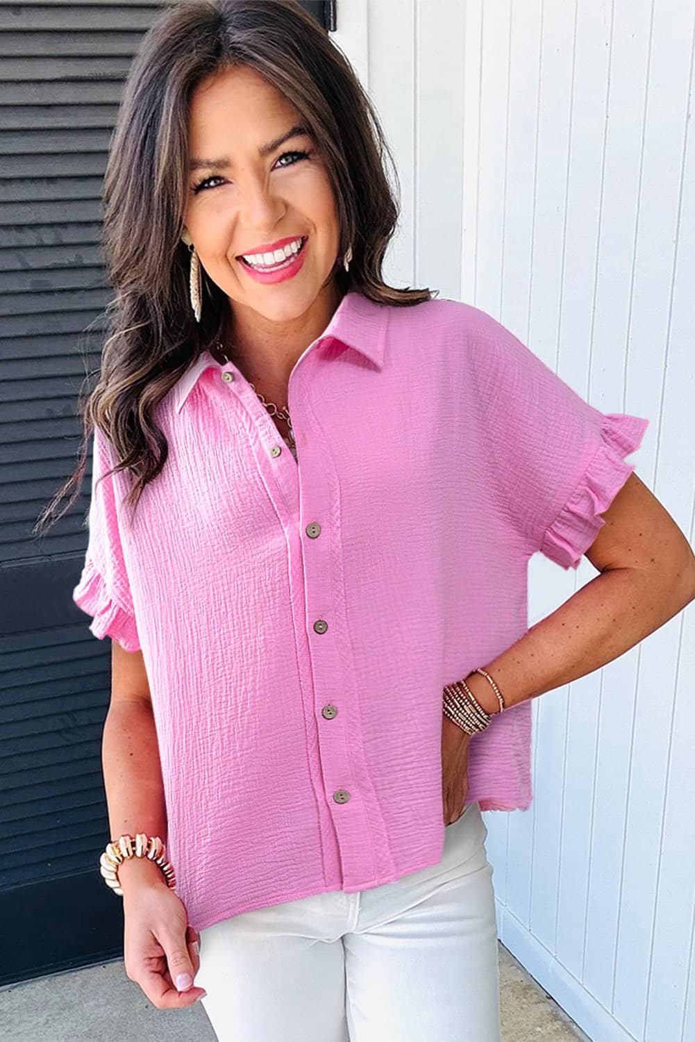 Collared neck, buttoned front, ruffled short sleeves and relaxed fit.