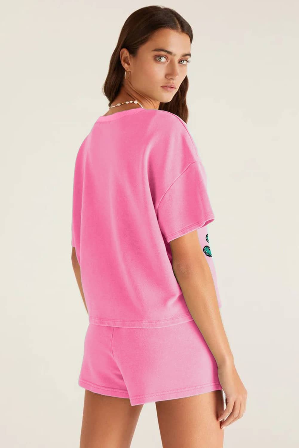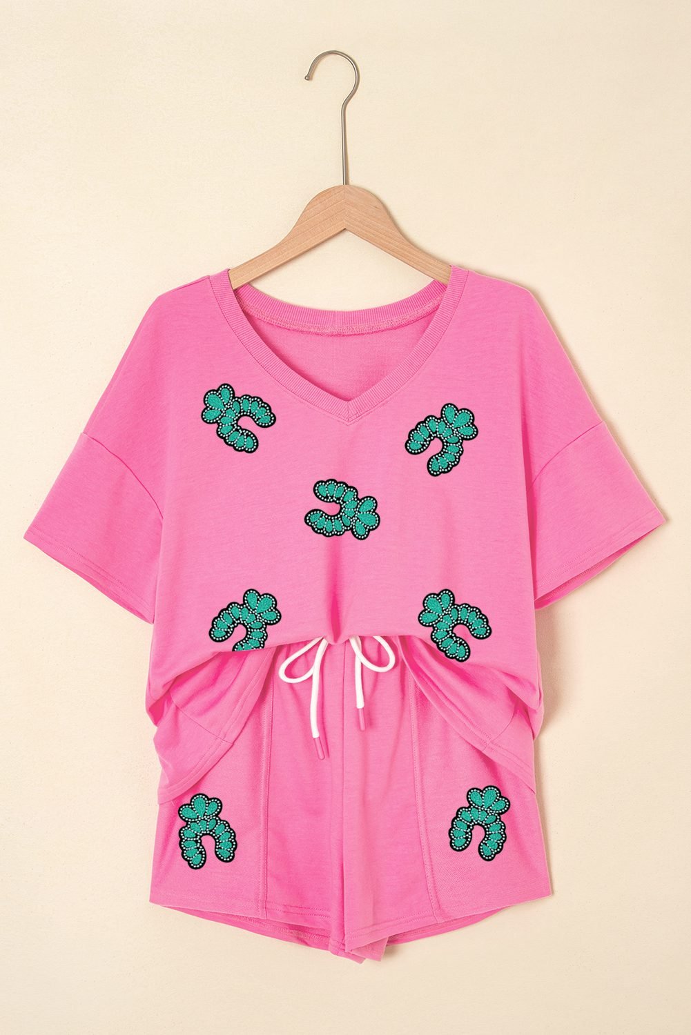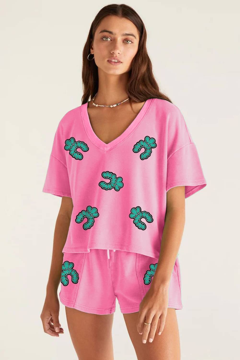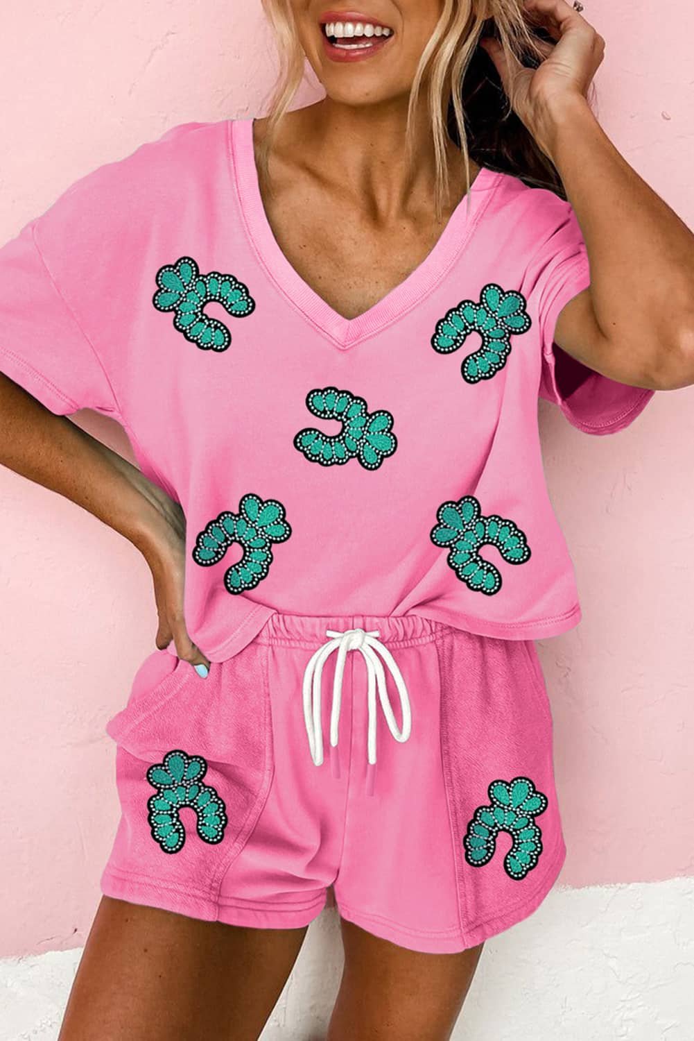 - This pink short set adds western vibe with sequin turquoise patched pattern.