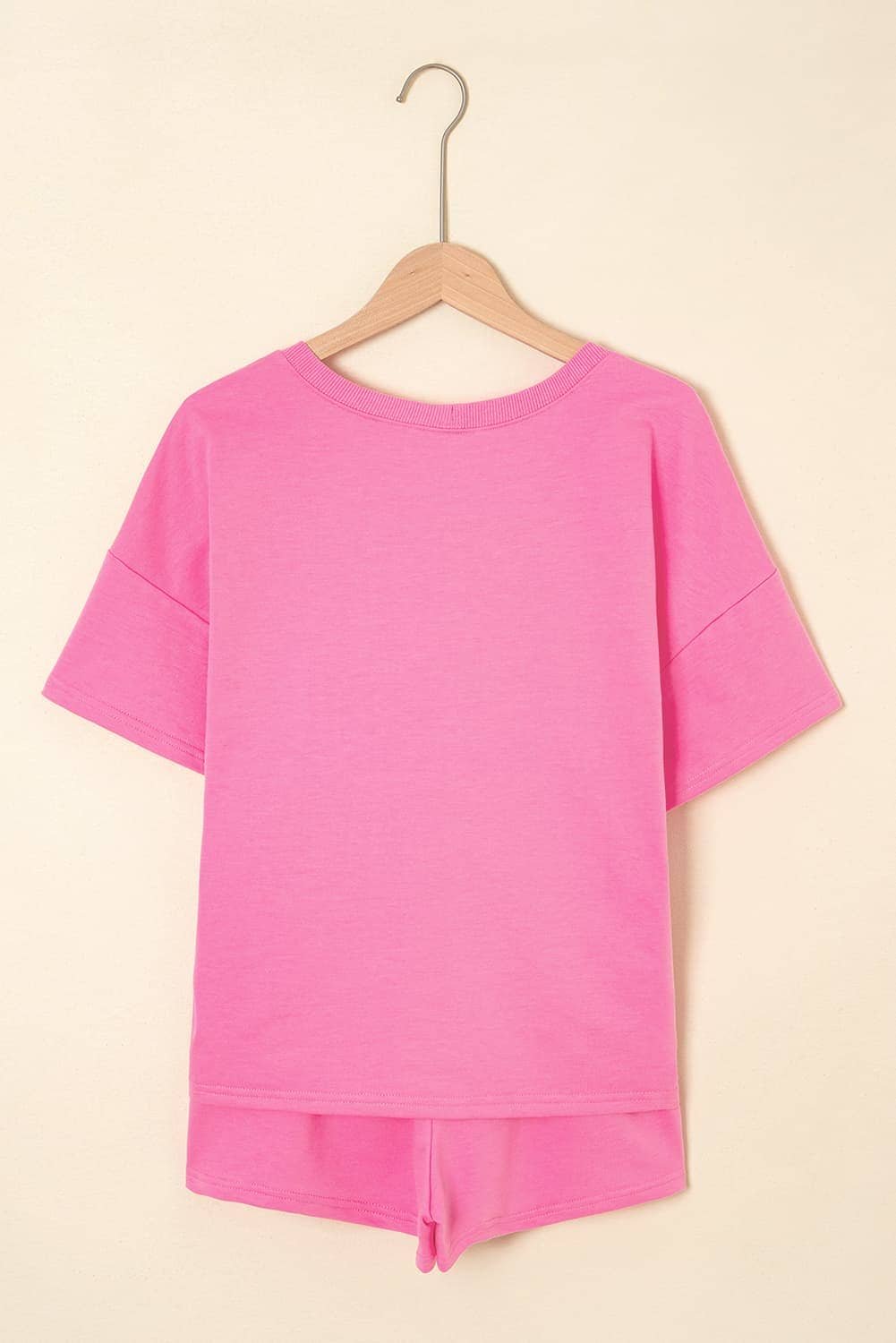 Wholesale shorts set include the v neck tee and matching drawstring shorts.