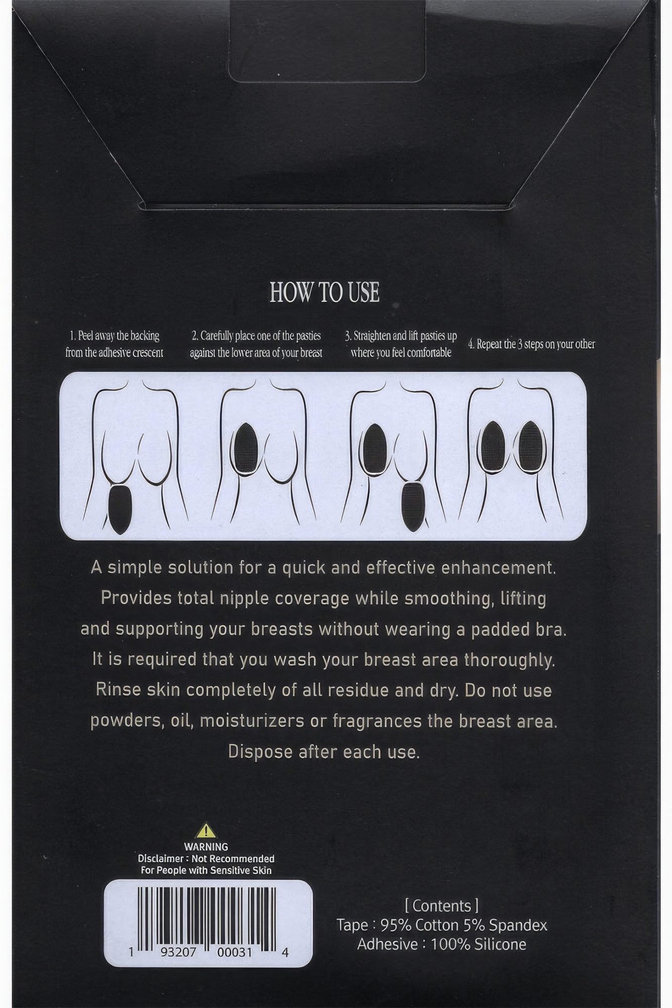 Introducing our Breast Lift Tape, the ultimate solution for quick and effective breast enhancement. Say goodbye to traditional bras and hello to total nipple coverage, smoothing, lifting, and support with our innovative tape.Key Features:- Tape Material: Made from 95% cotton and 5% spandex for a comfortable and flexible fit.- Adhesive: Crafted from 100% silicone, providing secure and long-lasting adhesion.- Pack Info: Each pack includes 3 pairs of breast lift tape for extended use.- Size Options: Available in two cup sizes, A-B and C-D, ensuring the perfect fit for your bust.- Color: Sleek black color for versatility and discretion under various clothing.Product Details:Enhanced Support: Our Breast Lift Tape provides reliable support and lift without the need for a padded bra, enhancing your natural shape.Comfortable Wear: The cotton-spandex blend ensures a soft and breathable feel against your skin, making it comfortable for all-day wear.Secure Adhesion: The silicone adhesive ensures a strong hold, keeping the tape in place even during movement.Why Choose Breast Lift TapeOur Breast Lift Tape offers a simple and effective solution for enhancing your bust without the constraints of traditional bras. Enjoy total freedom of movement while maintaining a lifted and supported silhouette.Ideal Occasions:Perfect for special events, formal occasions, or everyday wear when you want a lifted and seamless look without the bulk of a bra.