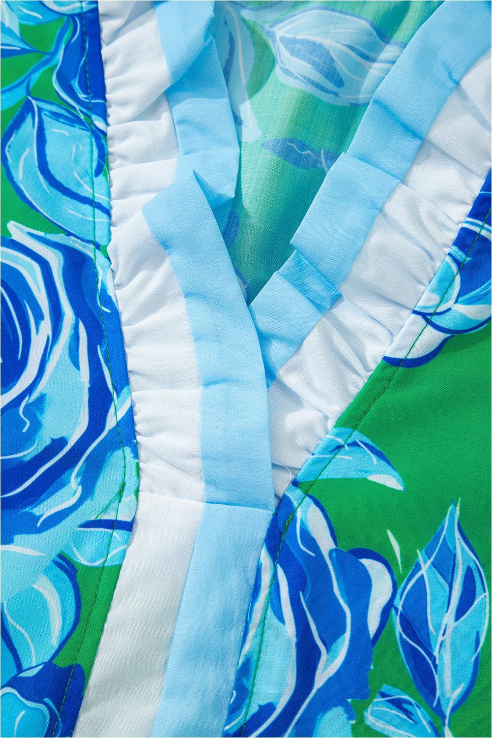 This floral blouse is elegant with ruffled short sleeves.