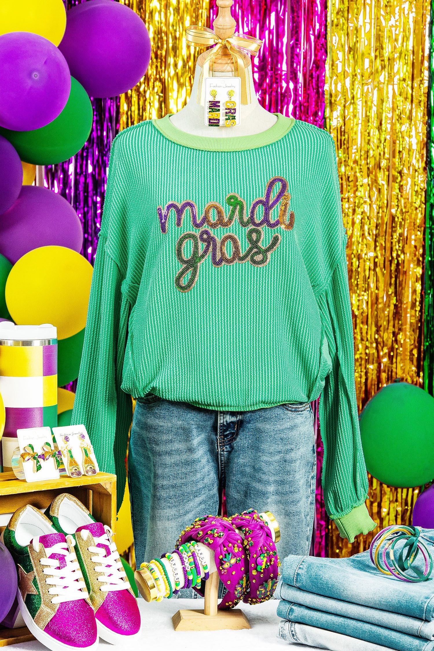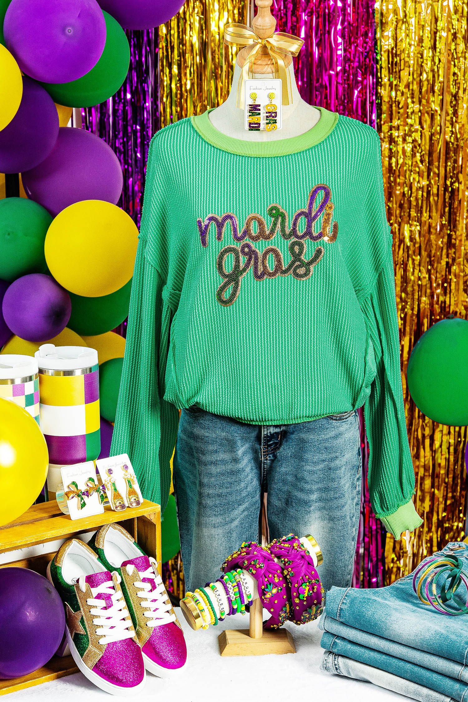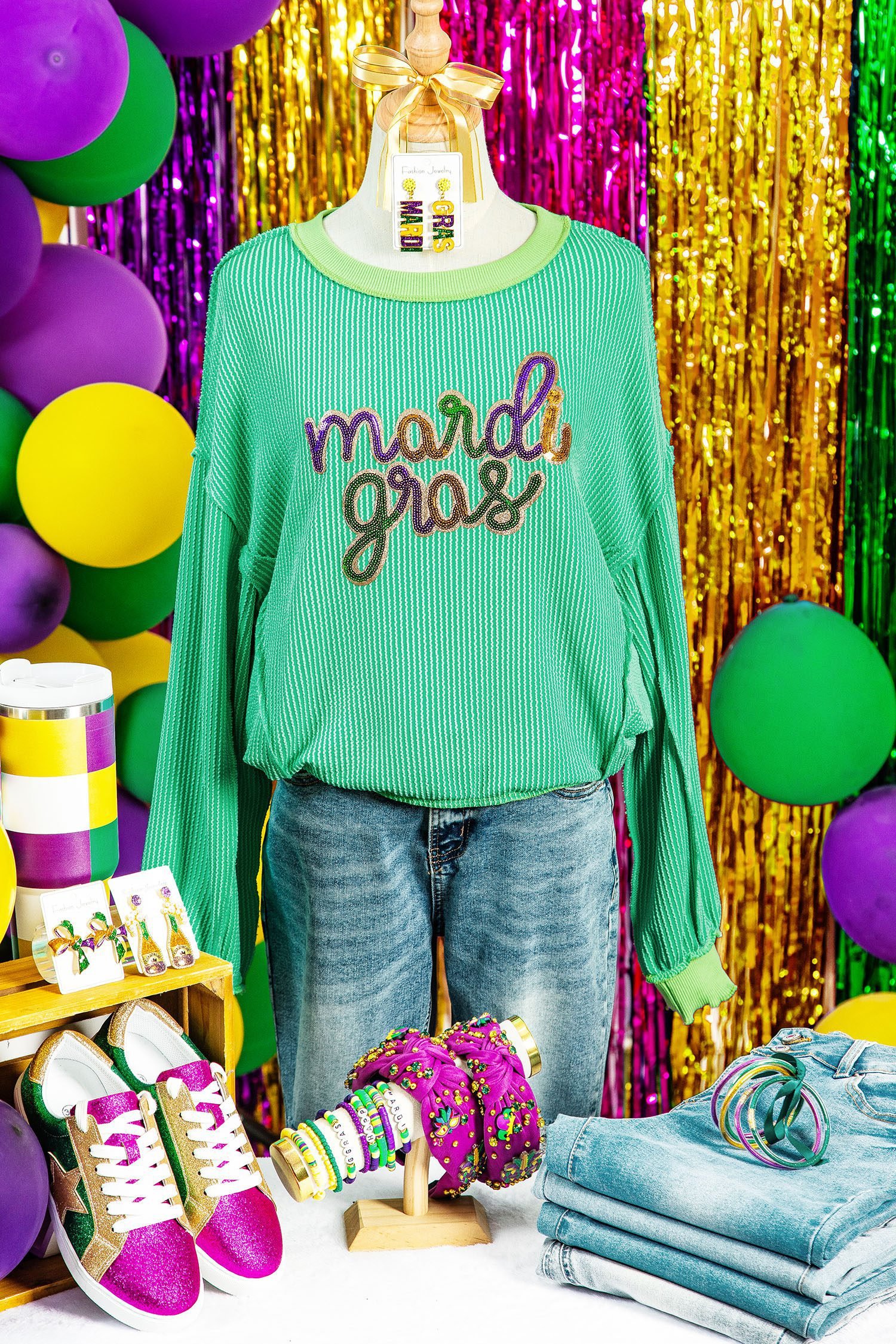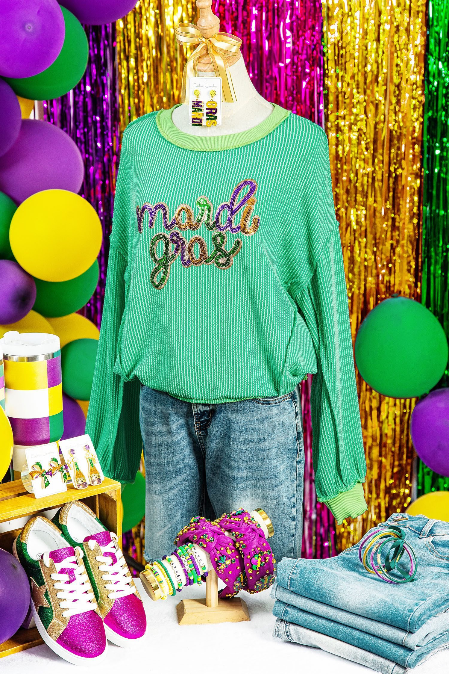 Bright Green Twisted Ribbed mardi gras Sequin Graphic Exposed Seam Patchwork Pullover Top