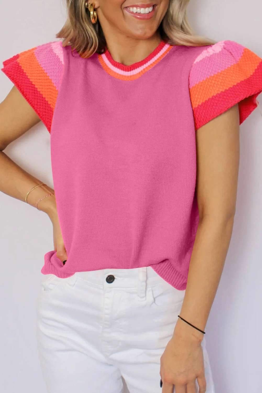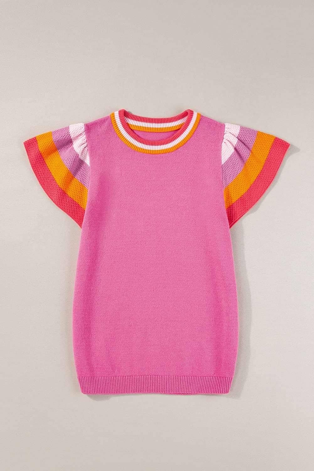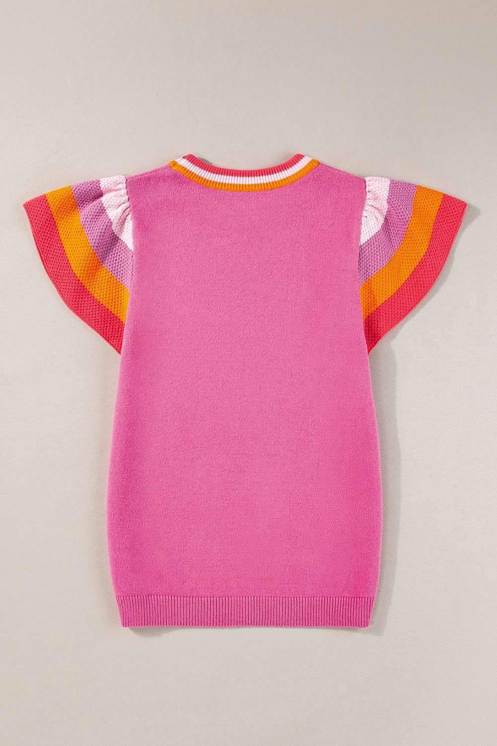 Bright Pink Contrast Flutter Sleeves Knitted Sweater T Shirt