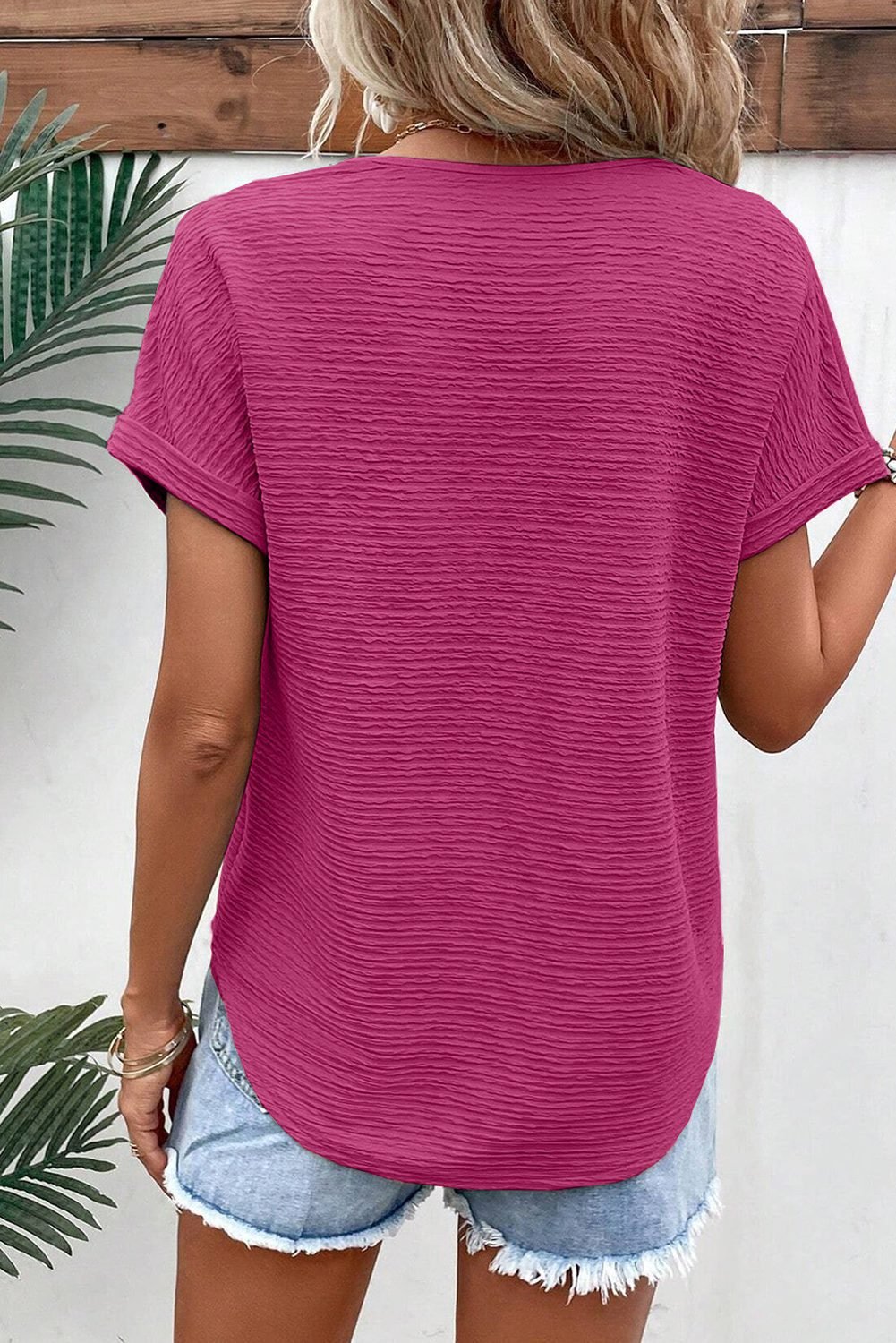 Bright Pink Textured Wide Sleeve V Neck T Shirt