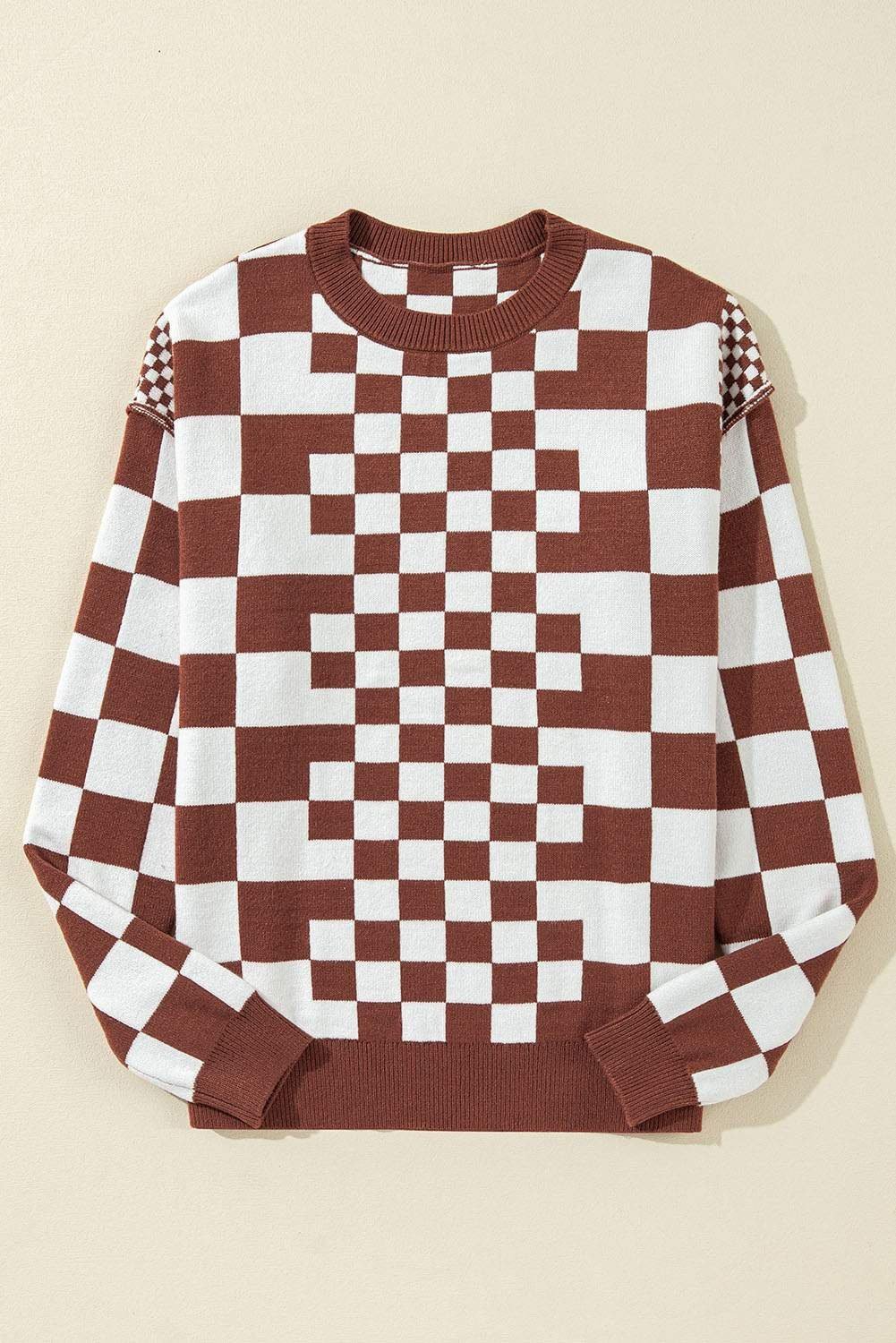 Brown Checkered Print Drop Shoulder Round Neck Sweater
