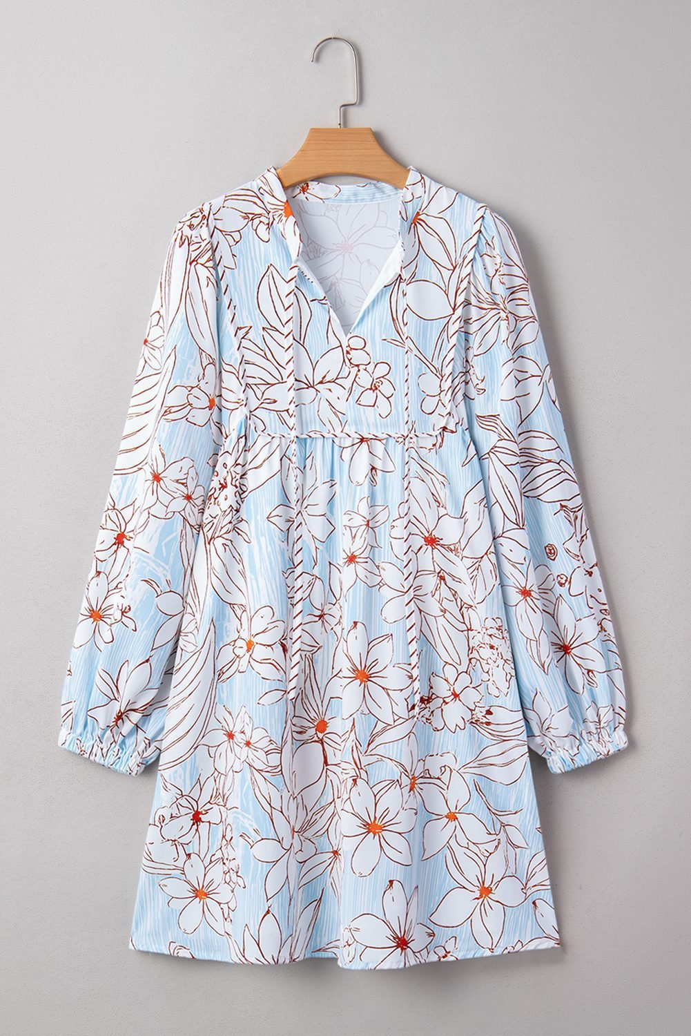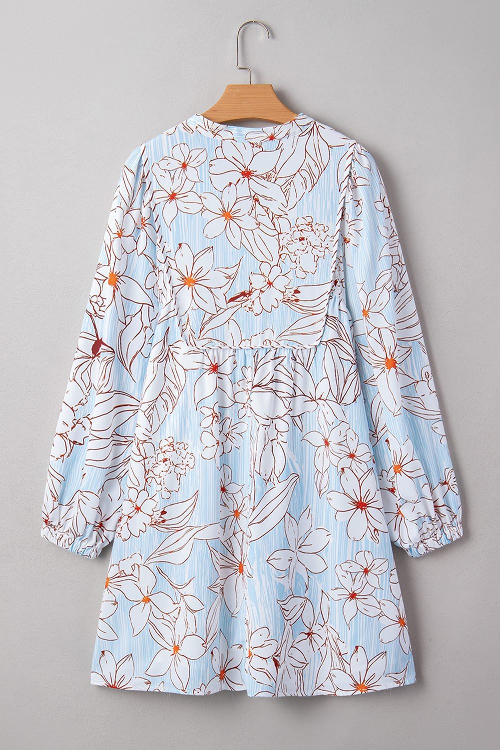Brown Floral Print Tie Neck 3/4 Sleeve Mini Dress