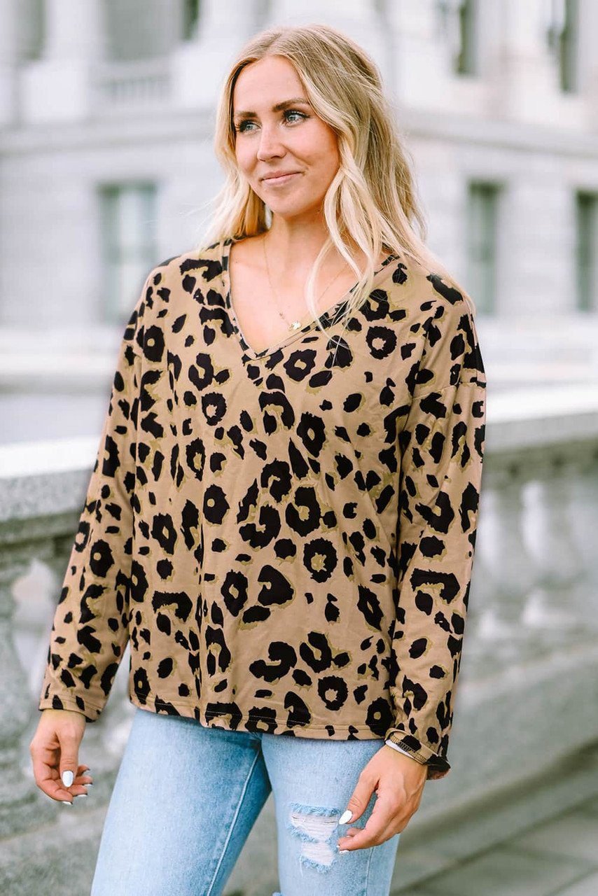 Brown Leopard Split Joint V Neck Long Sleeve Tops