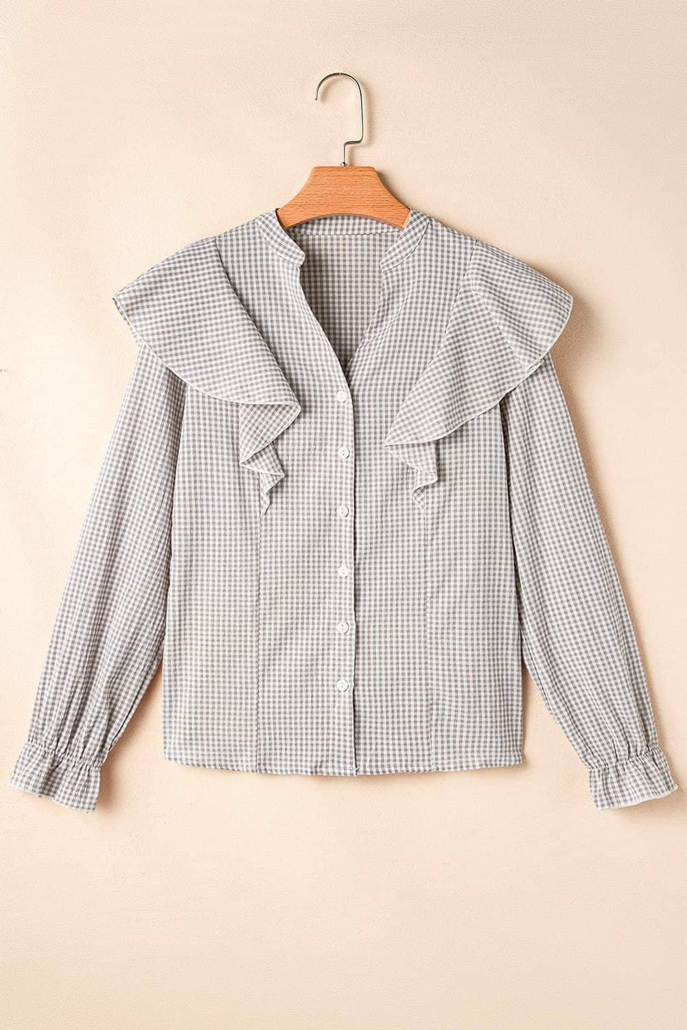 The notched neck and ruffles add a delicate feature to the plaid shirt.