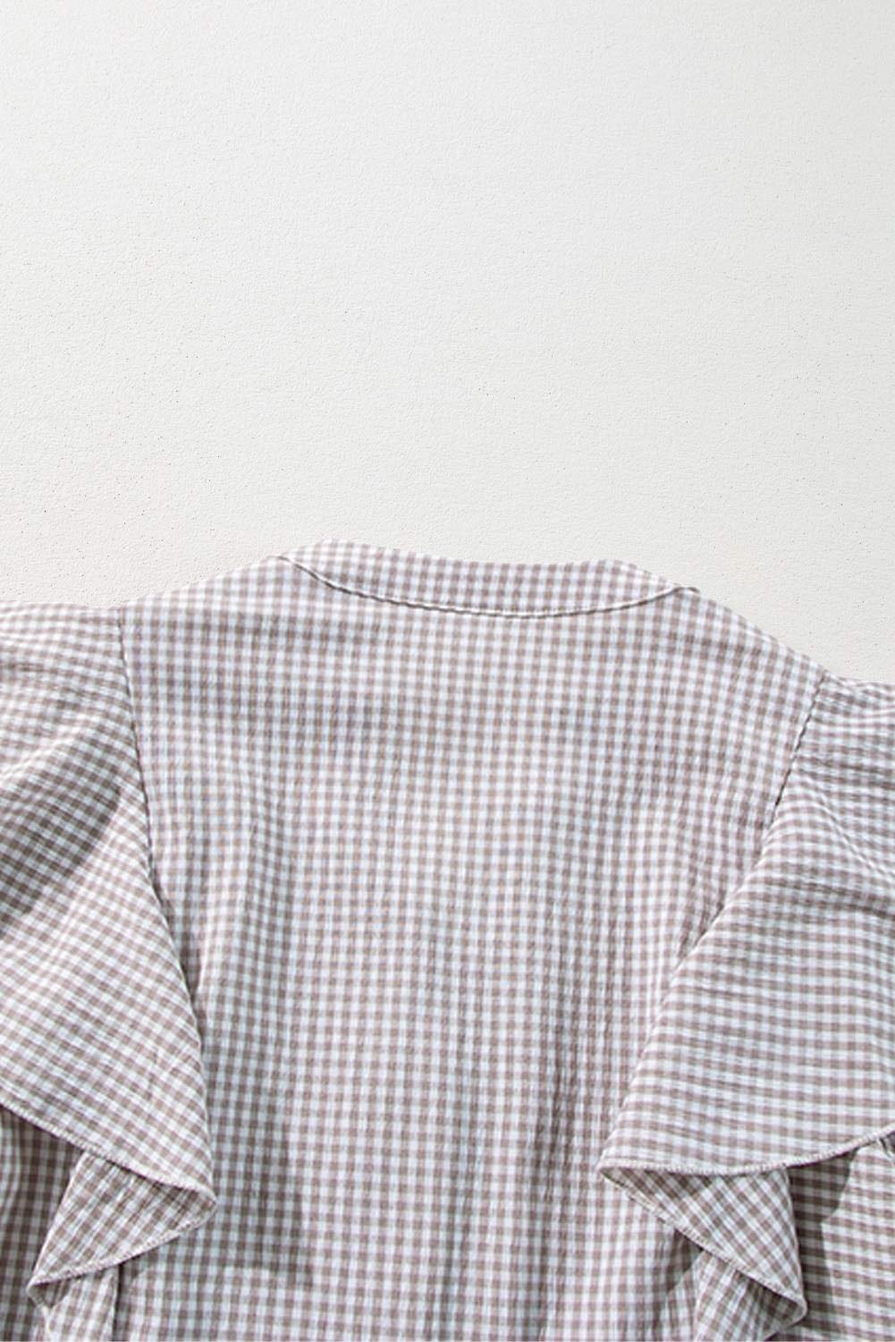 Brown Plaid Flounce Sleeve Notched Neck Ruffled Shirt
