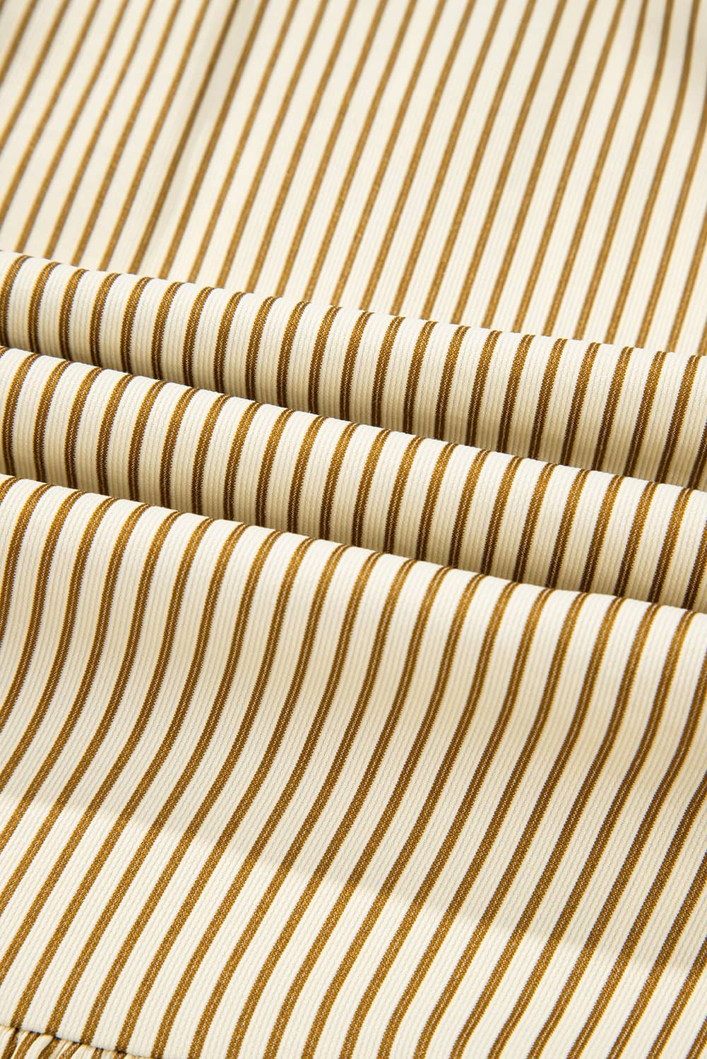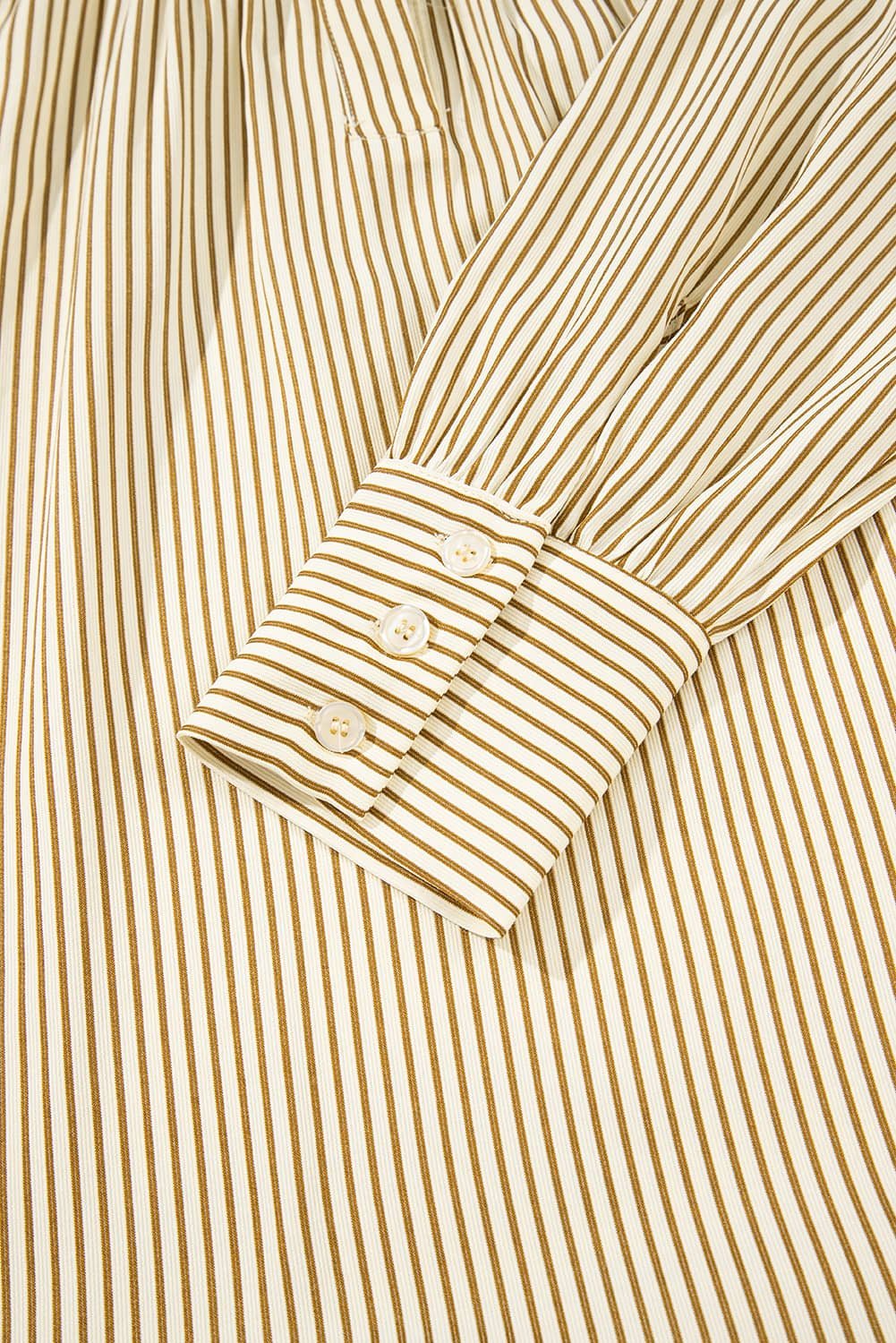 Collared neckline, partial button down front, long sleeves with button cuffs.