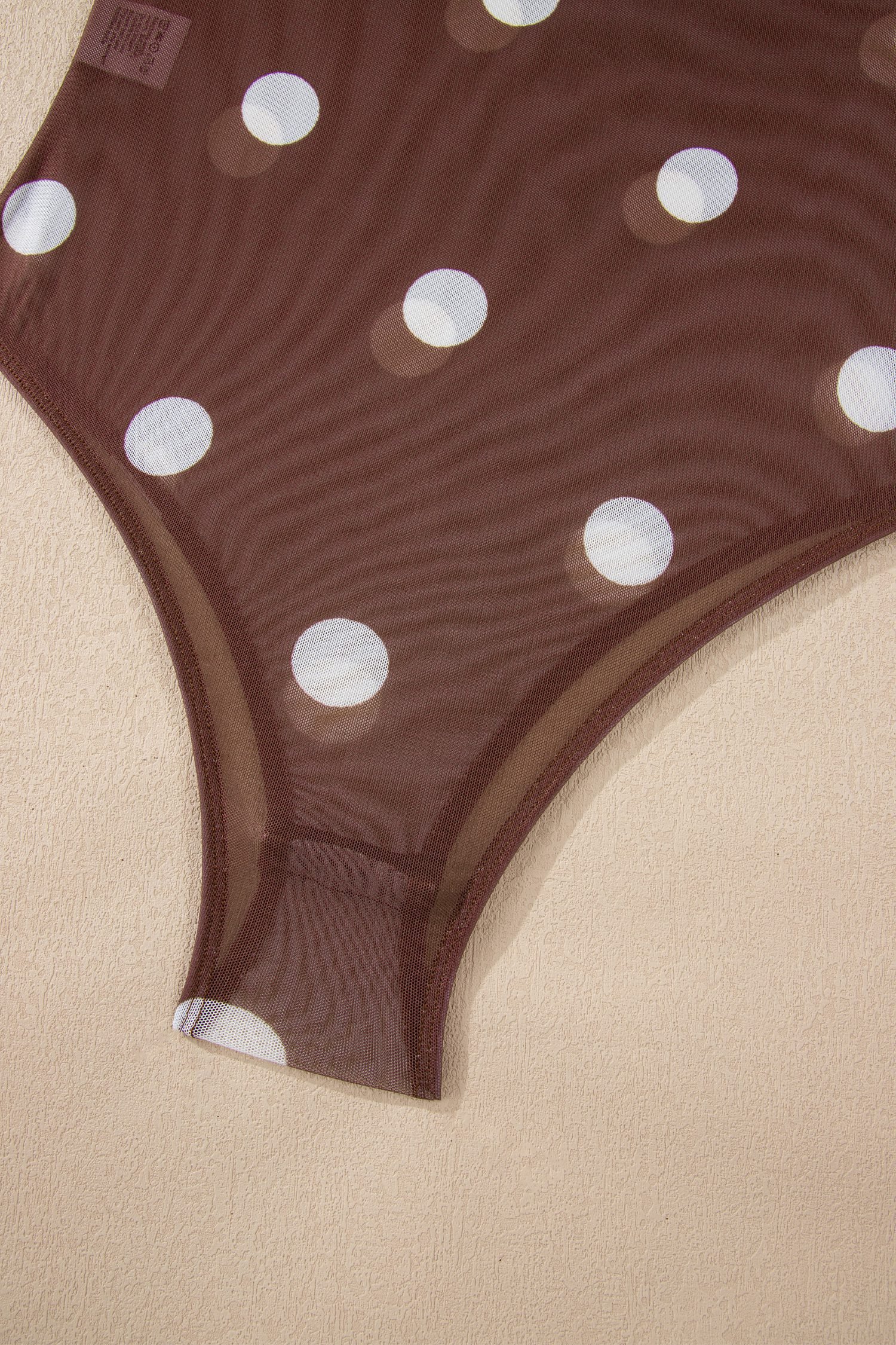 Brown Vintage Polka Dot Print Mesh Long Sleeve Bodysuit