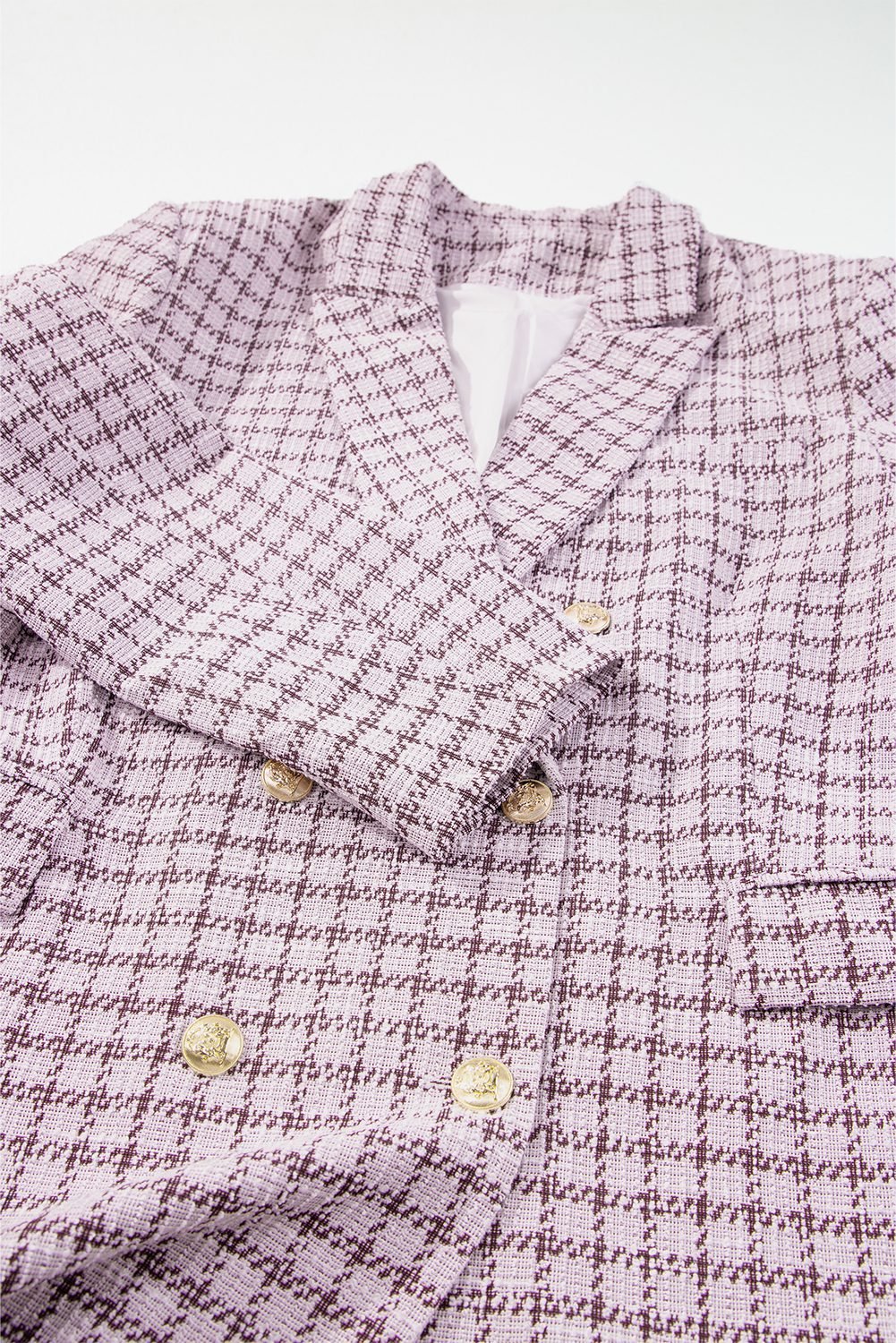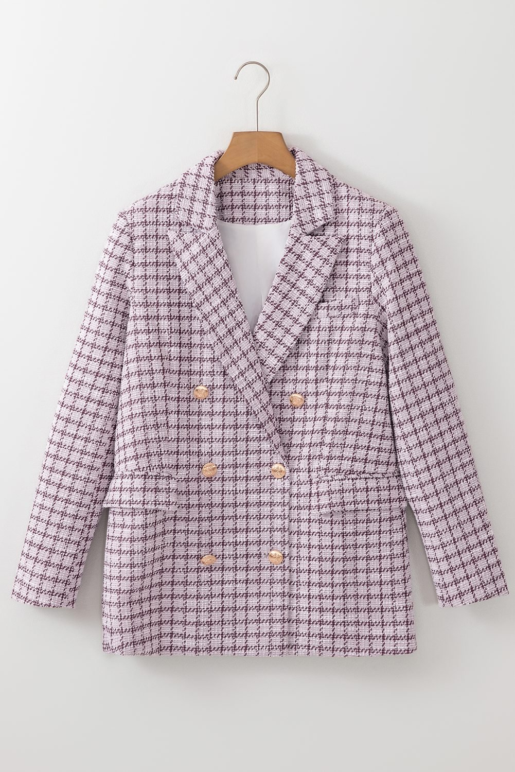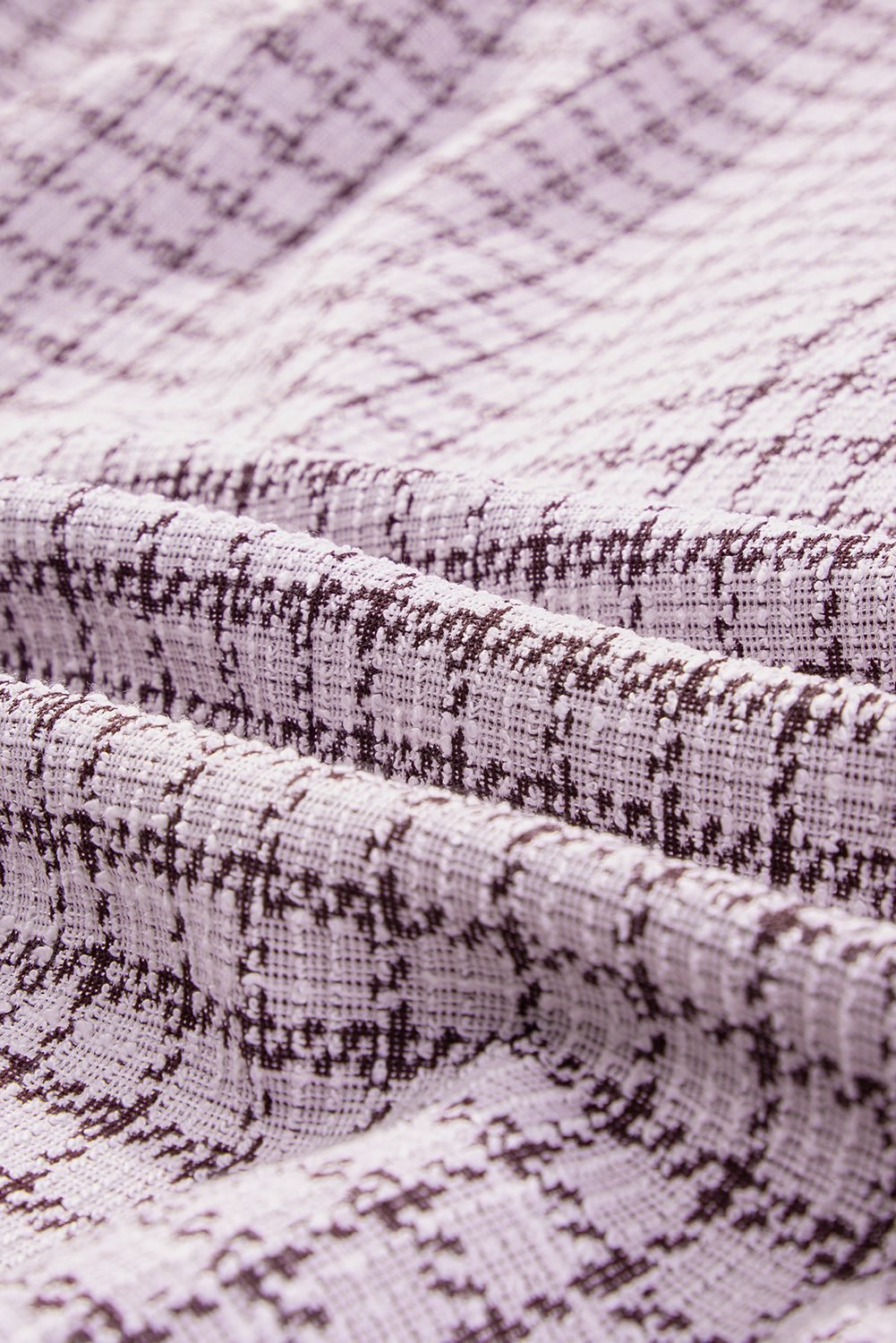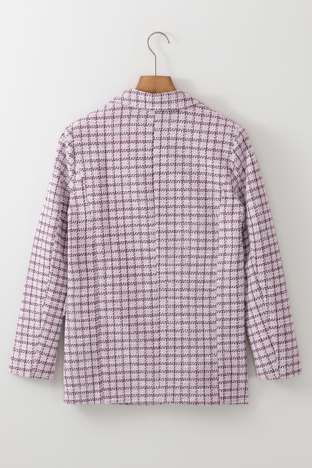 It features a tweed plaid pattern in a classic silhouette.