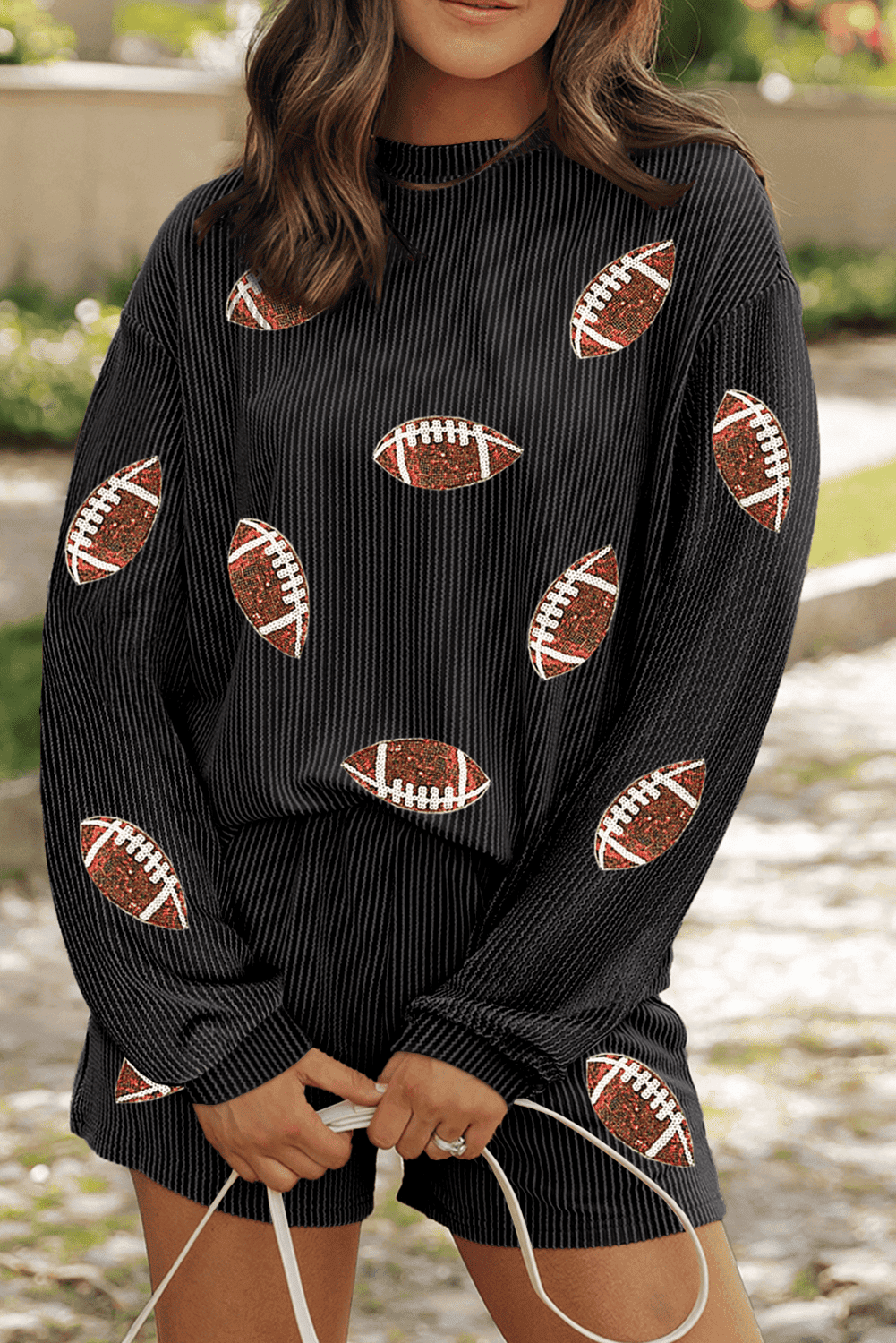 - Sparkle on the field with this sequin rugby football two-piece set.