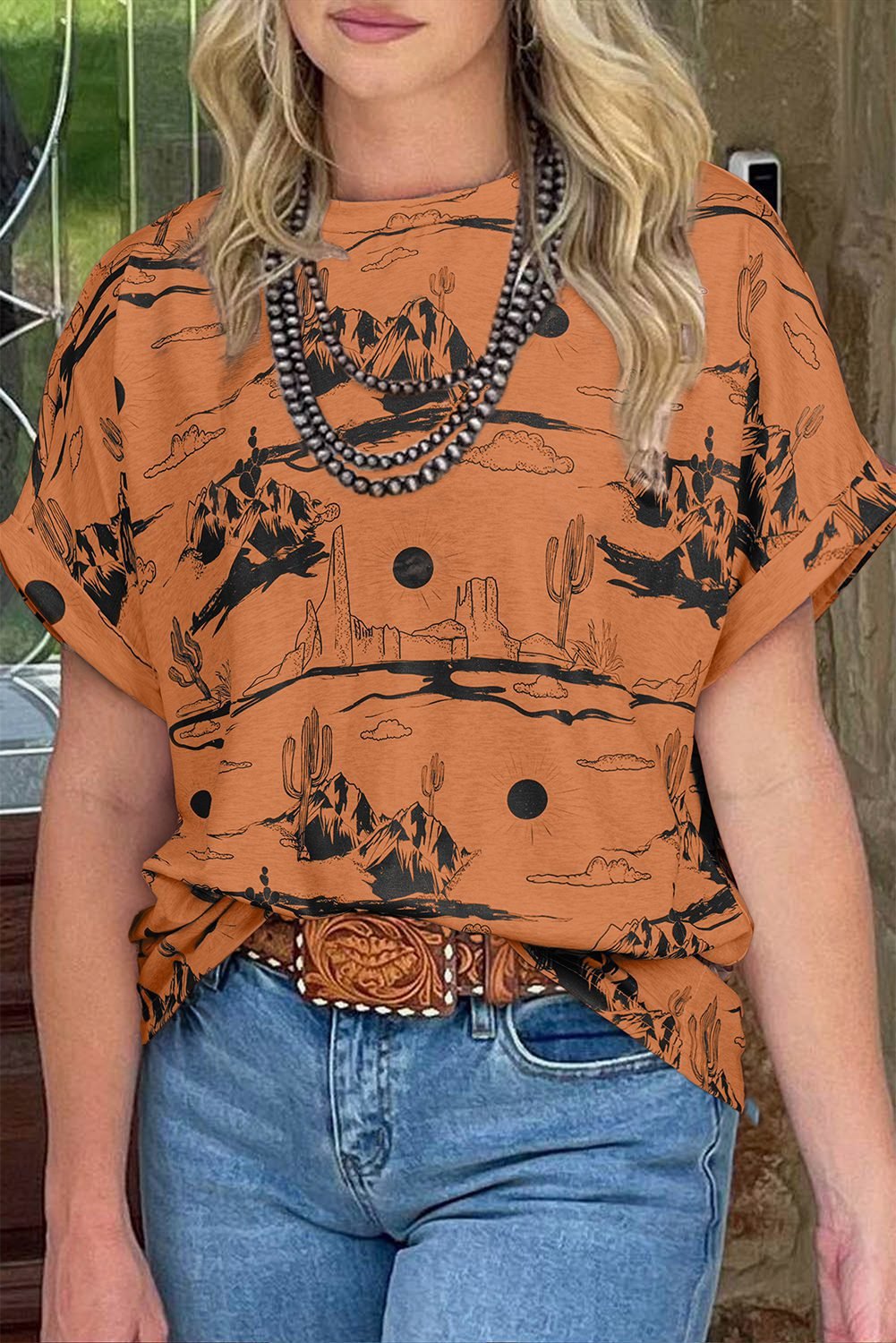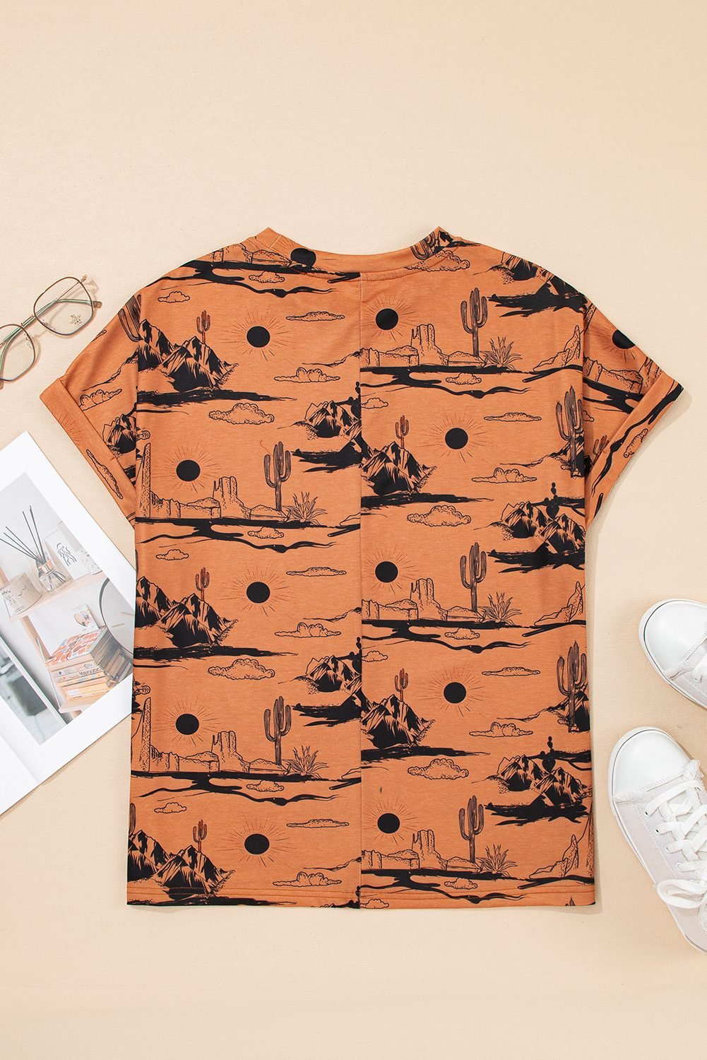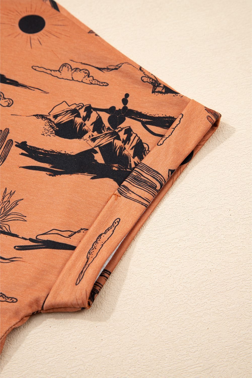 - Embrace the serenity of the desert with our Desert Sand Print Short Sleeve Knit Top.