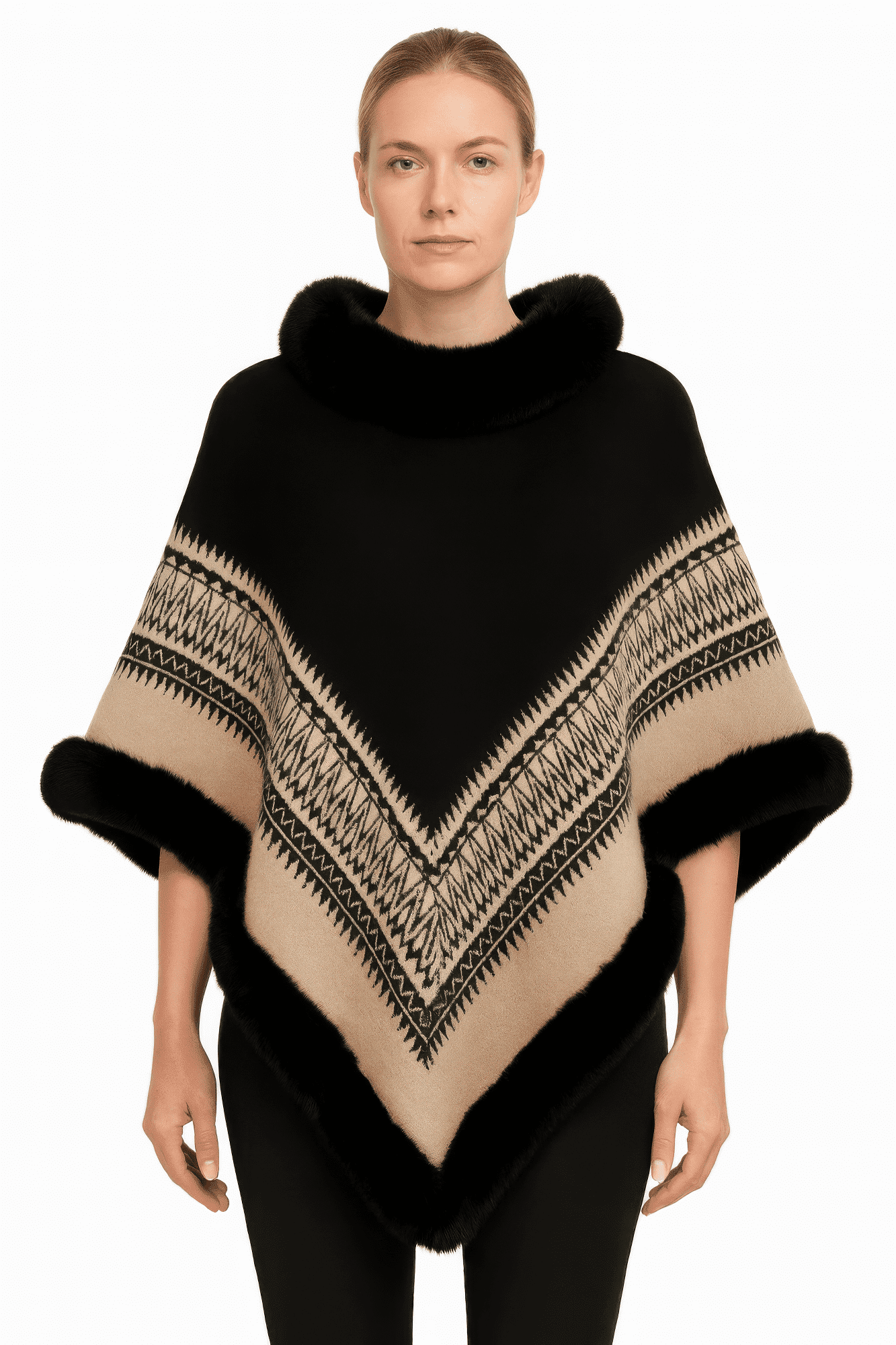 The Chevron Trim Poncho with Faux Fur Collar blends timeless charm with elevated comfort for the cooler seasons. Crafted in a rich black knit with a warm camel-toned chevron pattern, this poncho features a flattering V-point hem that drapes beautifully over any silhouette. The luxurious faux fur trims the collar and edges, adding softness and a touch of glamour. Designed with a relaxed fit and pull-on ease, it’s ideal for layering over casual or dressier looks. Whether you’re heading to a gathering or strolling the city, this piece delivers both warmth and polish.