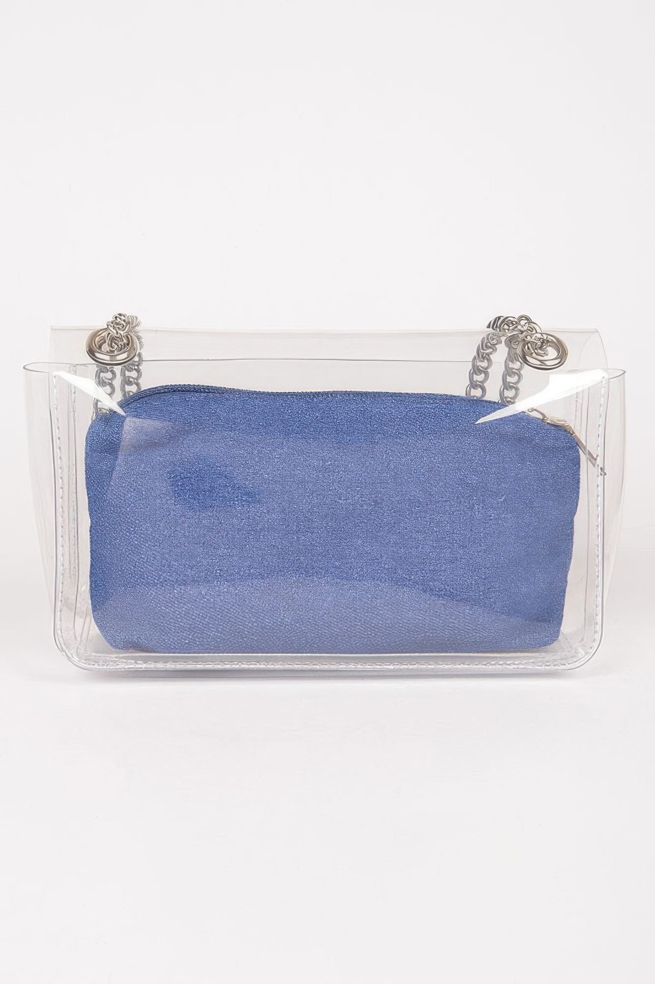 Stylish and event-ready, the Clear Bag with Denim Pouch blends fashion and function for on-the-go convenience. Featuring a transparent PVC outer shell and a removable denim-textured pouch, this versatile piece offers secure storage while keeping essentials in view. The sleek chain strap adds a touch of polish, making it easy to wear crossbody or on the shoulder. Perfect for music festivals, concerts, or venues with clear bag policies, it combines practical design with a casual-cool aesthetic. Whether you’re dressing for an event or a day out, this bag keeps you organized without sacrificing style.