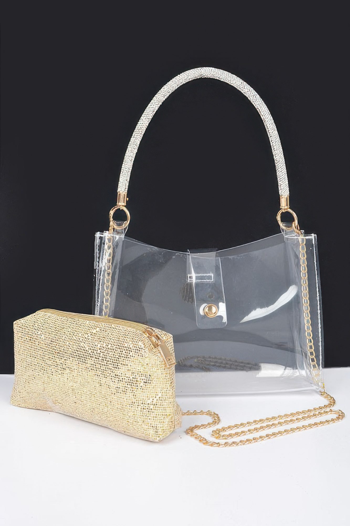 Product Description: Modern and eye-catching, the Clear Small Hobo Bag with Rhinestone Handle adds a bold twist to any look. Crafted from transparent PVC, this structured hobo-style bag is elevated by a dazzling rhinestone-encrusted handle that brings instant glamour. Its compact size makes it ideal for carrying essentials while keeping your outfit light and stylish. Perfect for events, nights out, or statement everyday wear, this bag blends contemporary design with elegant sparkle in one standout piece. Product Details: Made from durable, clear PVC for a sleek, modern look Features a rhinestone-encrusted handle for added sparkle Compact hobo silhouette holds everyday essentials Mixed metal accents enhance the design’s shine Approximate dimensions: 10″W x 7″H x 2.25″D Ideal for events, parties, or trend-forward everyday styling Size Guide: For accurate sizing guidance, please review our size chart available on the website. Shipping and Returns: Fast Shipping: We offer speedy delivery to your doorstep. Hassle-Free Returns: If you’re not completely satisfied, our flexible return policy ensures your peace of mind.
