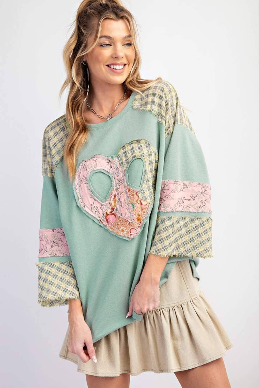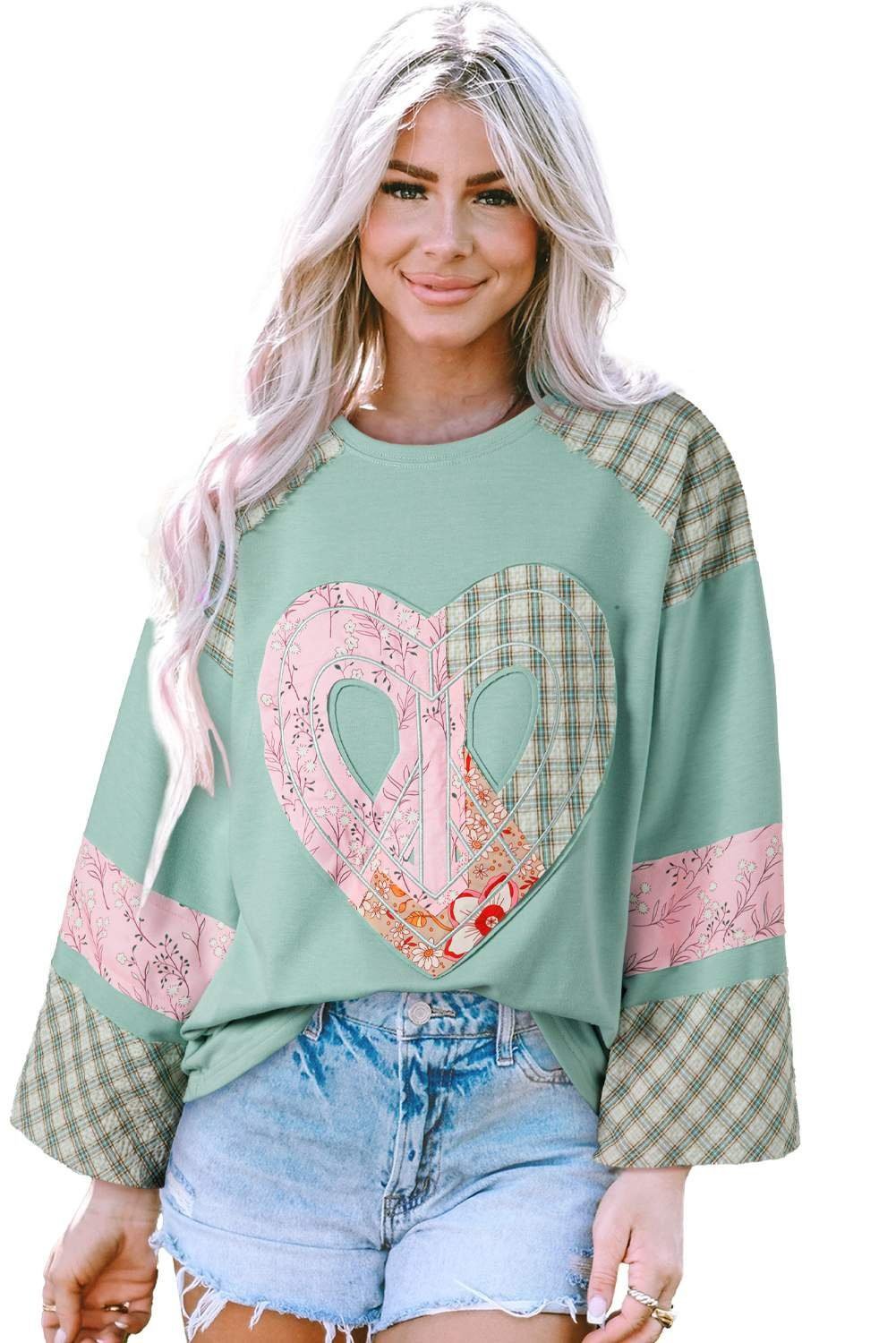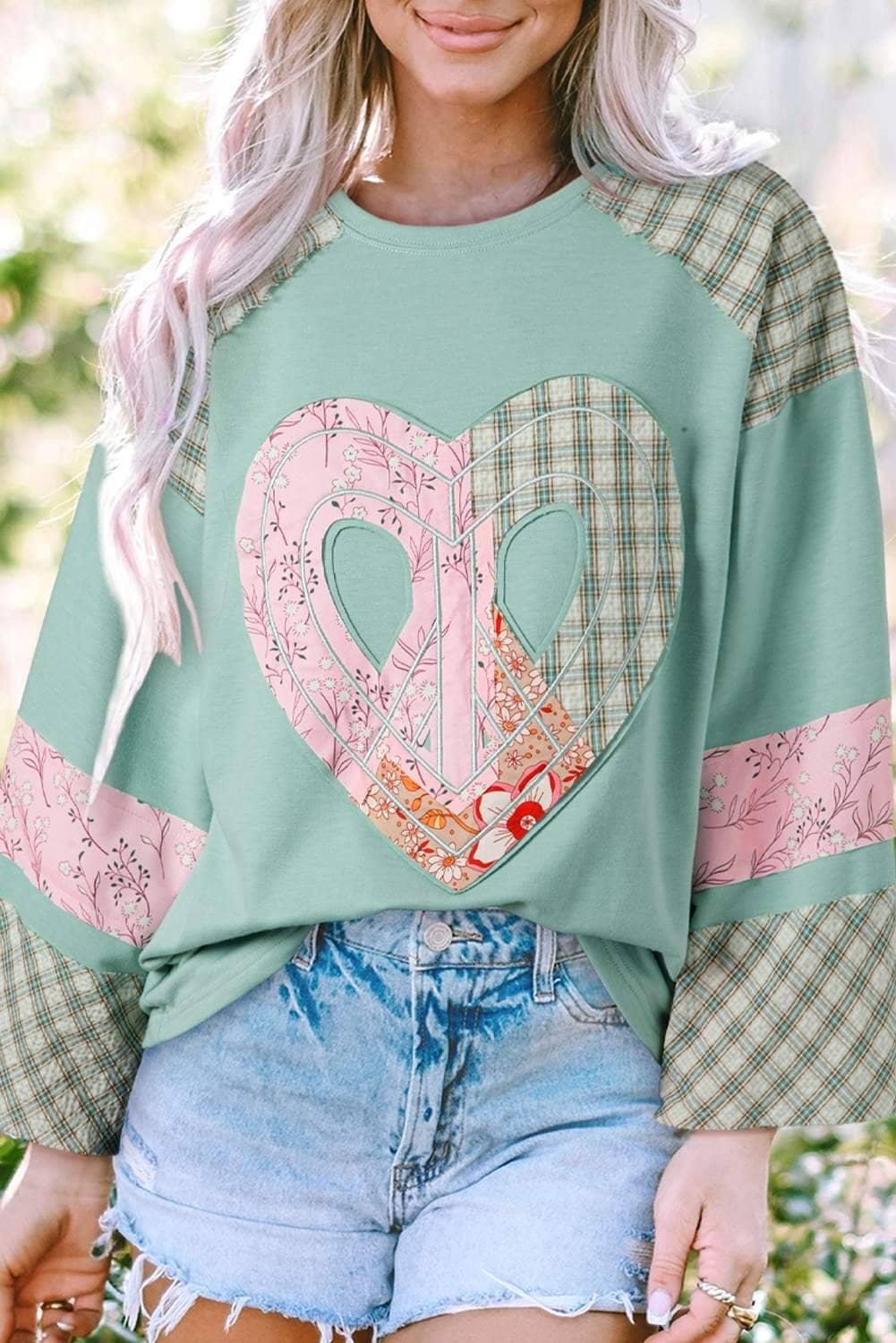 Clearly Aqua Plaid Floral Peace Heart Graphic Wide Long Sleeve Top