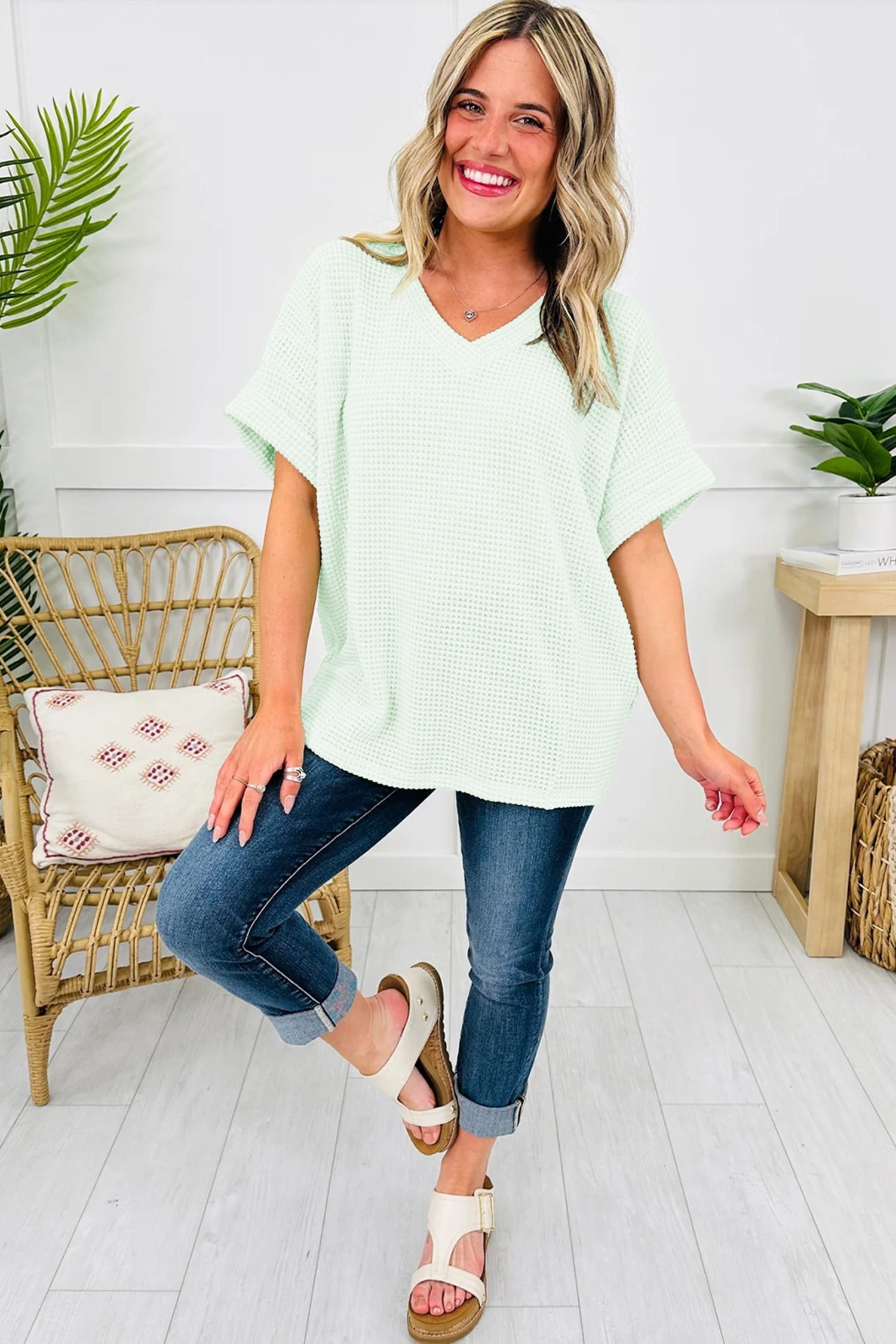 Clearly Aqua Waffle V Neck Short Sleeve Knit Top