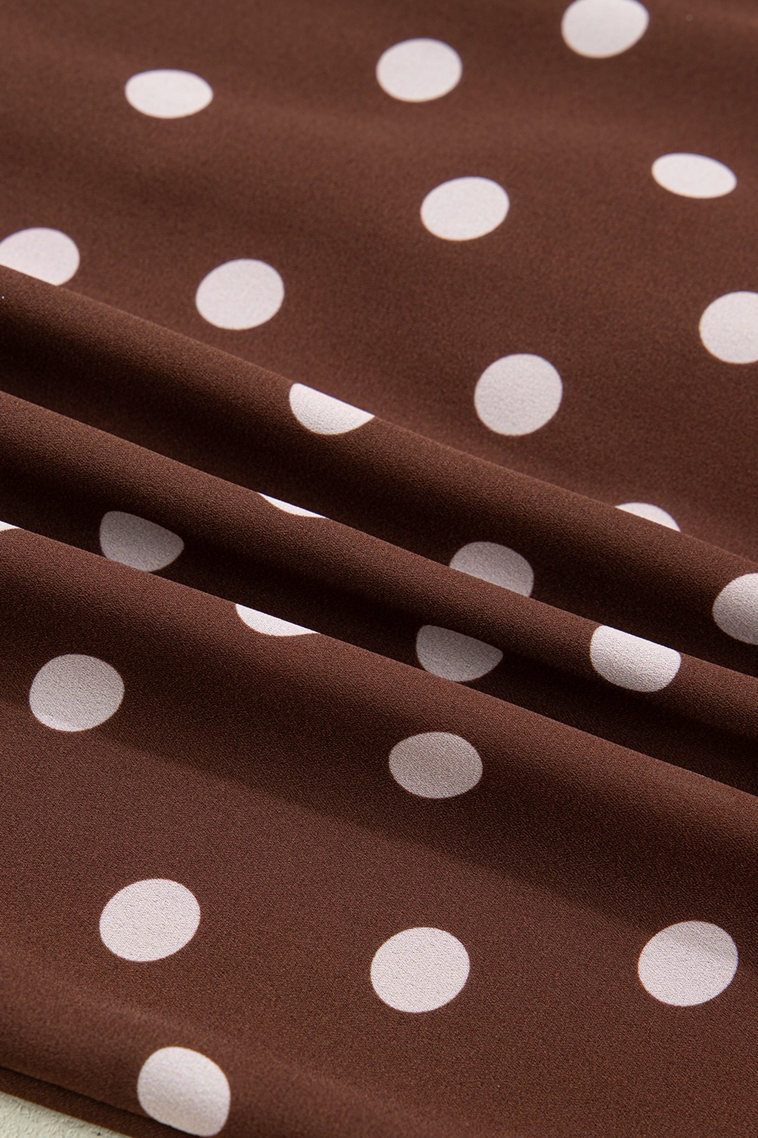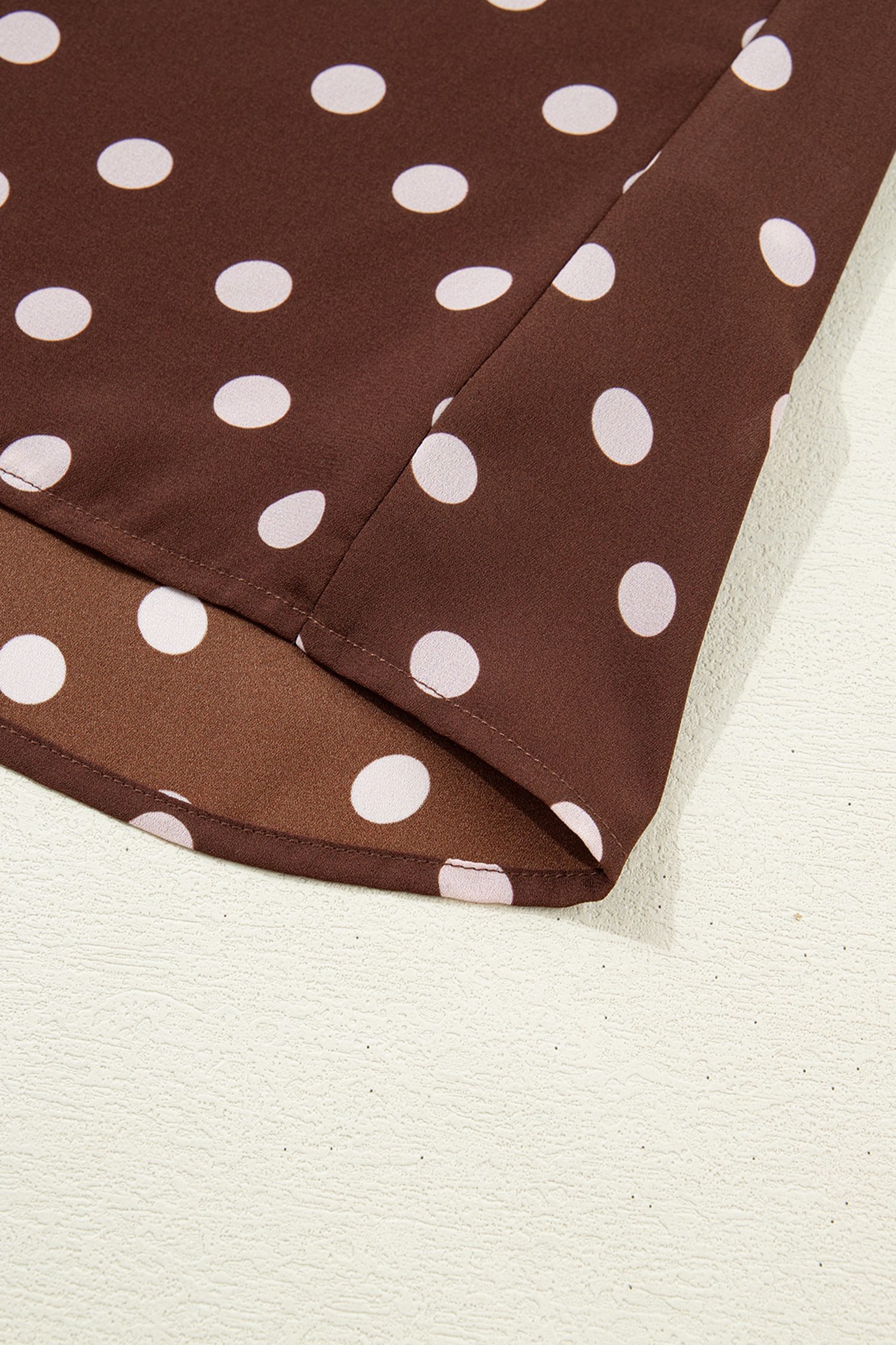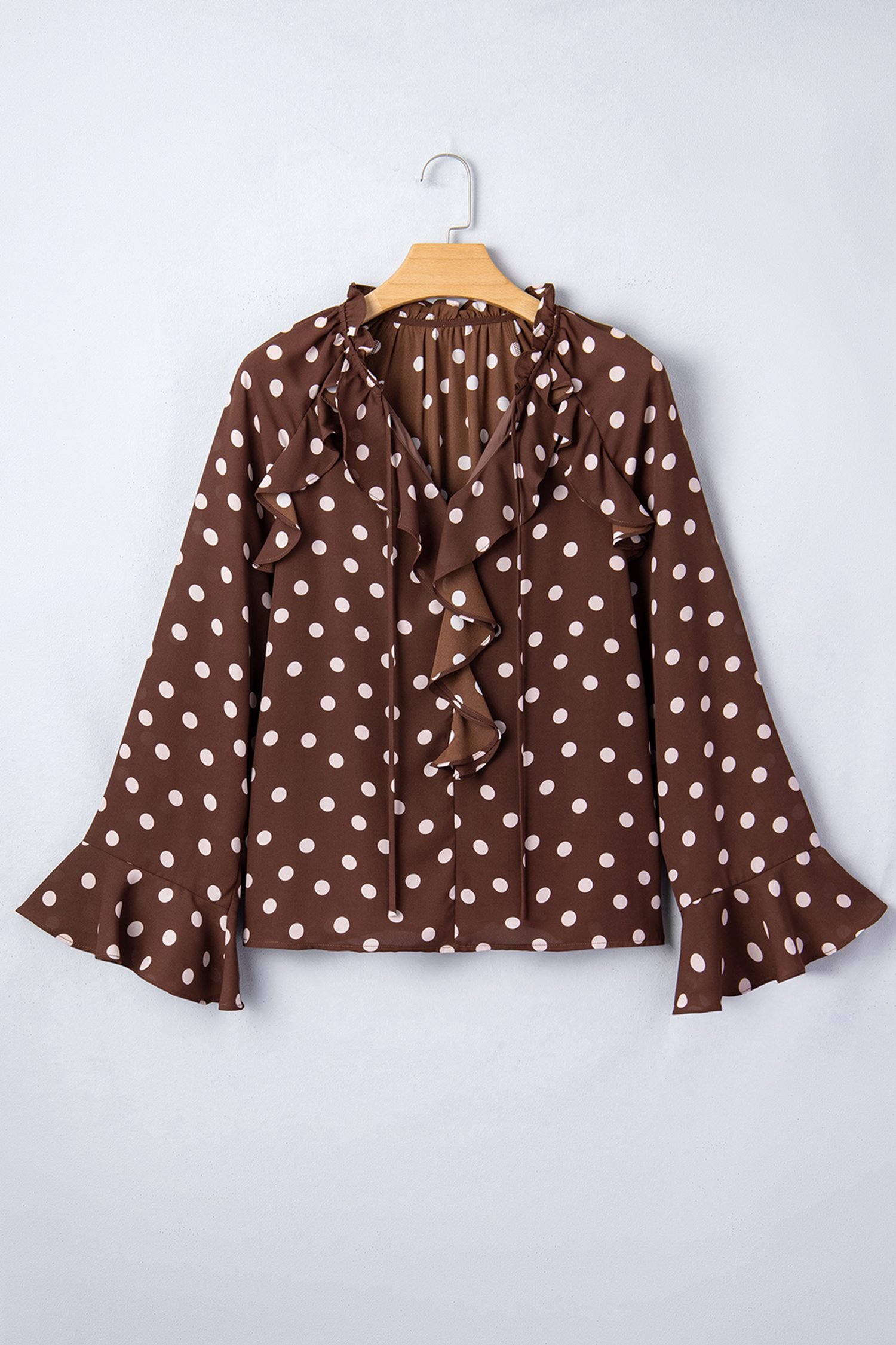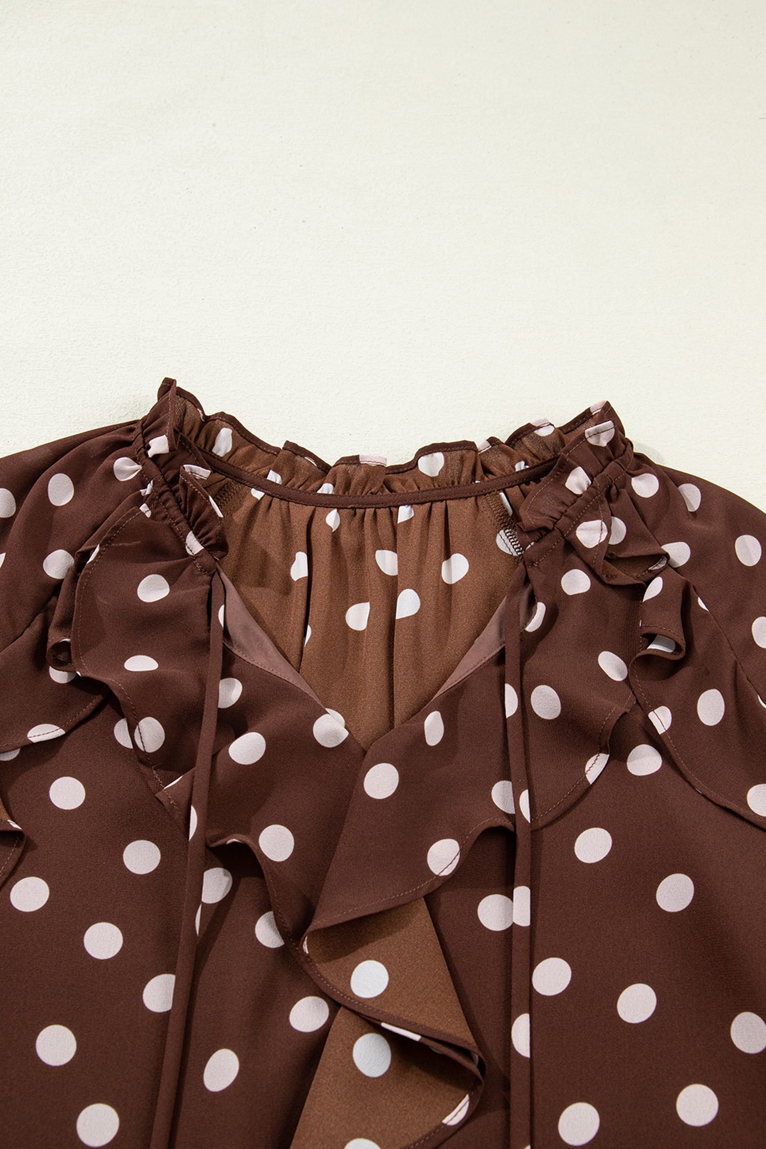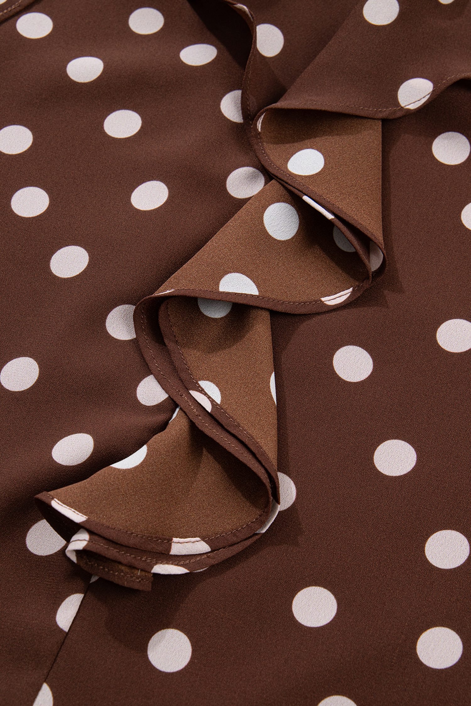 Classic polka dot print, ruffled details, and a tie neck.