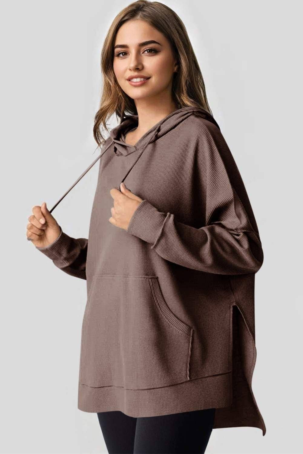 Coffee Waffle Knit Fleece Lined High Low Oversized Hoodie