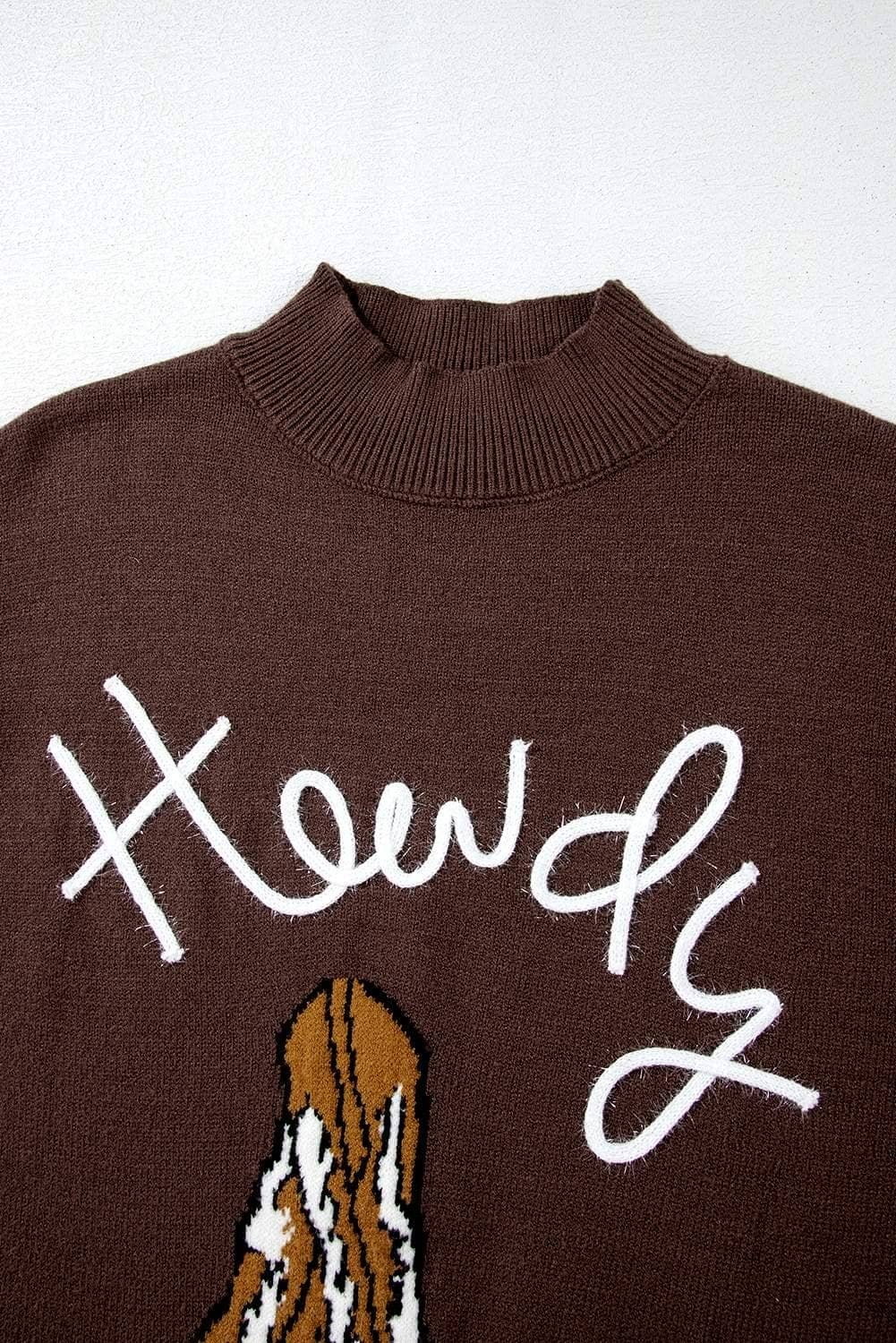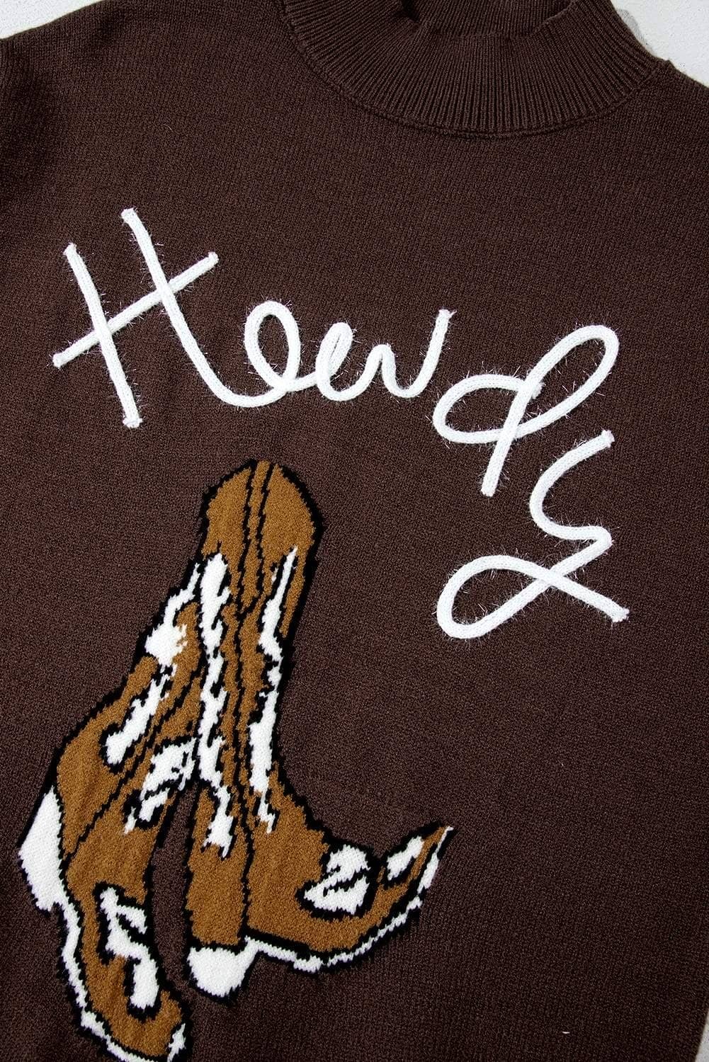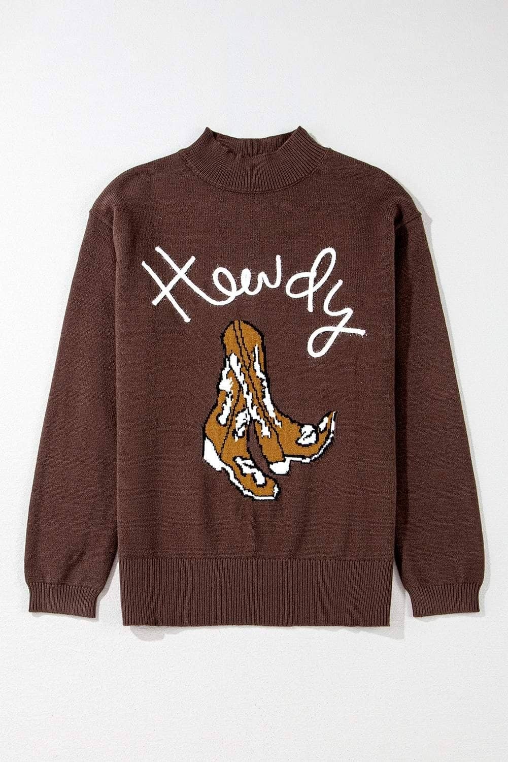 The “Howdy†and boot graphics add a playful Western vibe to this cozy sweater.
