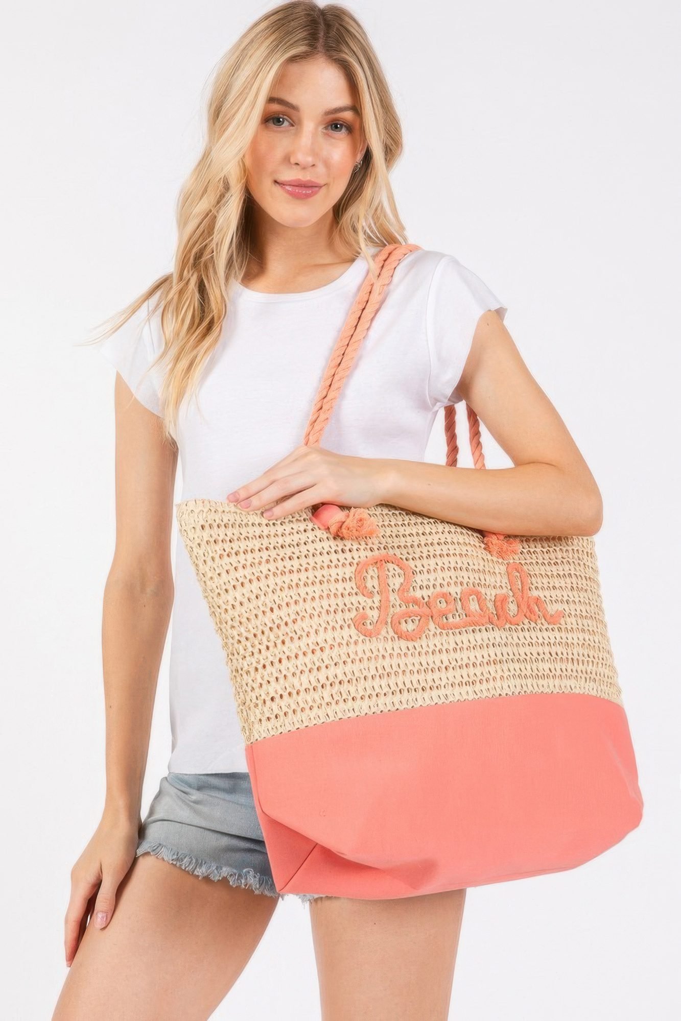 Elevate your beach style with our Color Sewn Rope Beach Letter And Strap Crochet Fabric Tote Bag. Designed for both style and practicality, this spacious tote features vibrant beach-inspired letters and a durable crochet fabric, making it the perfect companion for your summer adventures. Key Features: Fabric: Made from a blend of 70% paper and 30% polyester, this tote features a crochet fabric construction for a unique texture, with sewn rope handles that add a touch of elegance and sturdiness. The “Beach” letter design makes a fun and bold statement, while the spacious interior keeps all your items organized. Fit: With its large size, this tote is perfect for carrying all your beach essentials, including towels, sunscreen, snacks, and more. Color Options: Available in a range of lively colors, including Blue, Coral, Green, Hot Pink, Navy, Orange, and Yellow-each offering a vibrant look that brings a sunny vibe to any outfit. Sizes: Dimensions are 20.5″X15″X5.5″, providing ample space for everything you need, while remaining comfortable to carry. Design: The “Beach” lettering paired with crochet fabric and sewn rope handles creates a stylish, beachy vibe that’s perfect for warm-weather outings. Versatile Styling: Ideal for beach days, poolside lounging, shopping, or as a fun statement bag for everyday summer wear. Product Details: Comfortable All-Day Wear: Lightweight and easy to carry, this tote ensures comfort even during long summer days. Quality Craftsmanship: Crafted with a focus on durability, this bag is built to withstand summer adventures, from beach days to picnics. Why Choose Color Sewn Rope Beach Letter And Strap Crochet Fabric Tote Bag This tote combines playful design with practical functionality. Whether you’re spending the day at the beach, running errands, or enjoying a weekend getaway, this bag offers ample space and a stylish look. Ideal Occasions: Perfect for beach outings, pool days, casual summer outings, or even as a daily carry-all. It’s versatile enough to complement any laid-back summer look.