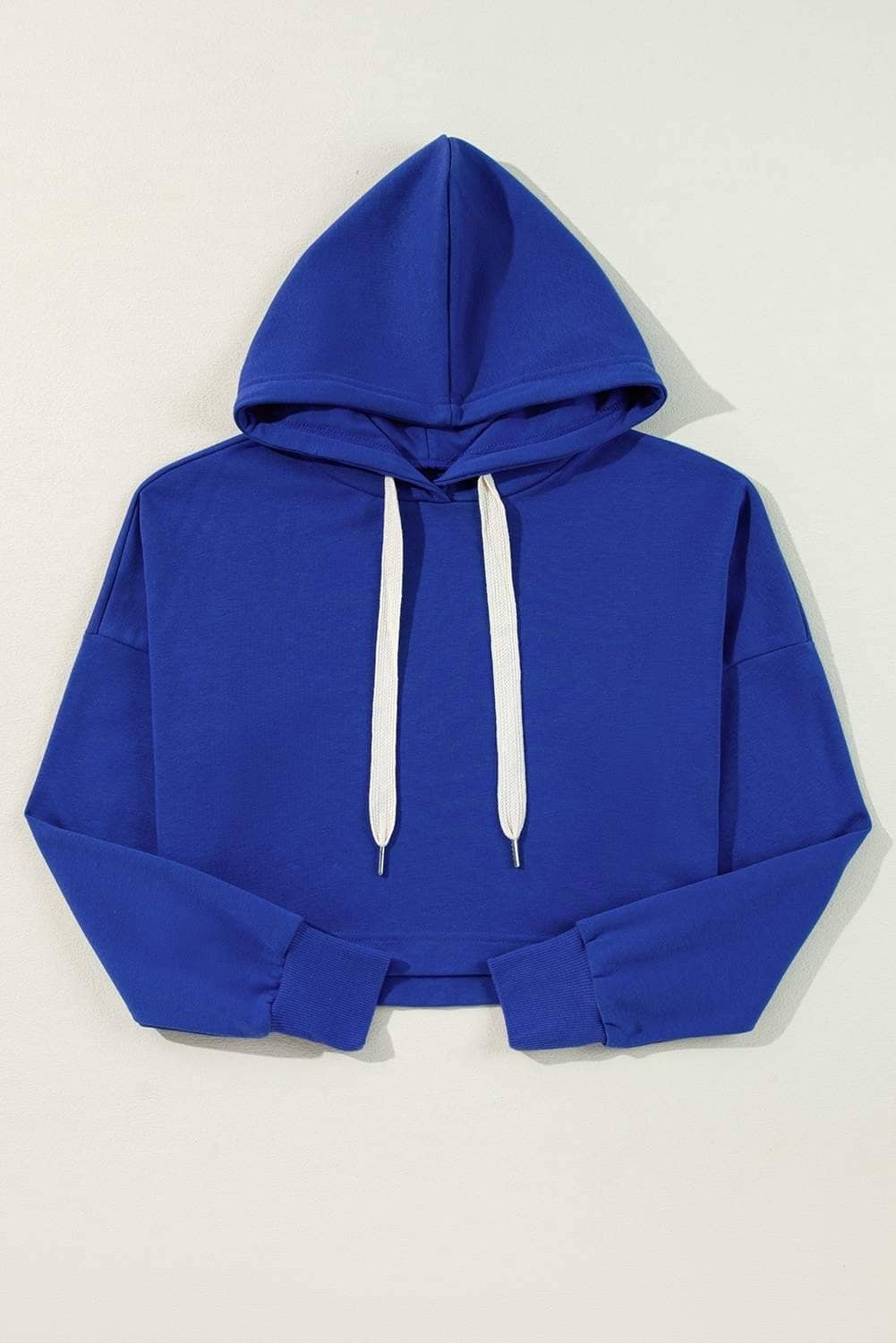 Dark Blue Solid Drop Shoulder Drawstring Cropped Hoodie