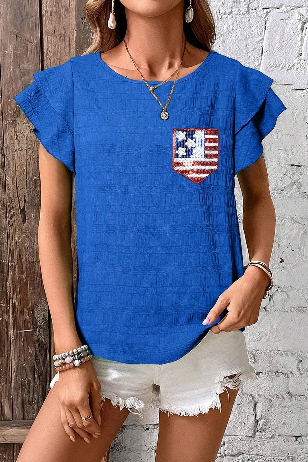 Dark Blue Textured Sequin Stars And Stripes Patched Ruffled Short Sleeve Blouse